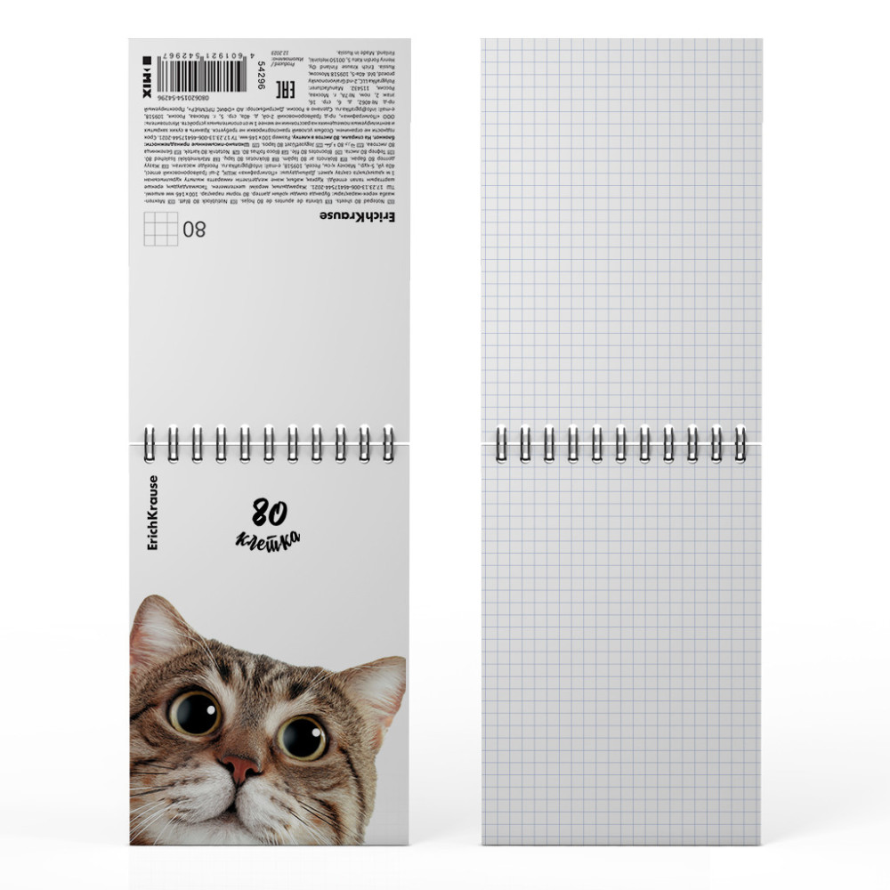 Блокнот ErichKrause "Котики". Обложка из высококачественного мелованного картона плотностью 170 г/м2. Плотная подложка 340 г/м2. В блоке 80 листов в клетку. Бумага офсетная плотностью 60 г/м2. Цвет линовки - синий. Тип скрепления - спираль