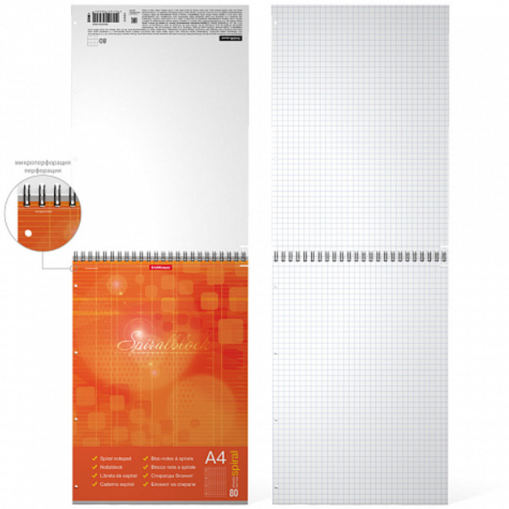 Блокнот формата А4 (210х297 мм). Обложка из высококачественного мелованного картона плотностью 190 г/м2. Жесткая подложка. В блоке 80 листов в клетку. Бумага офсетная плотностью 60 г/м2. Перфорация для подшивки. Микроперфорация для отрыва. Цвет линовки - синий. Тип скрепления - спираль. Блокноты разных цветов.
