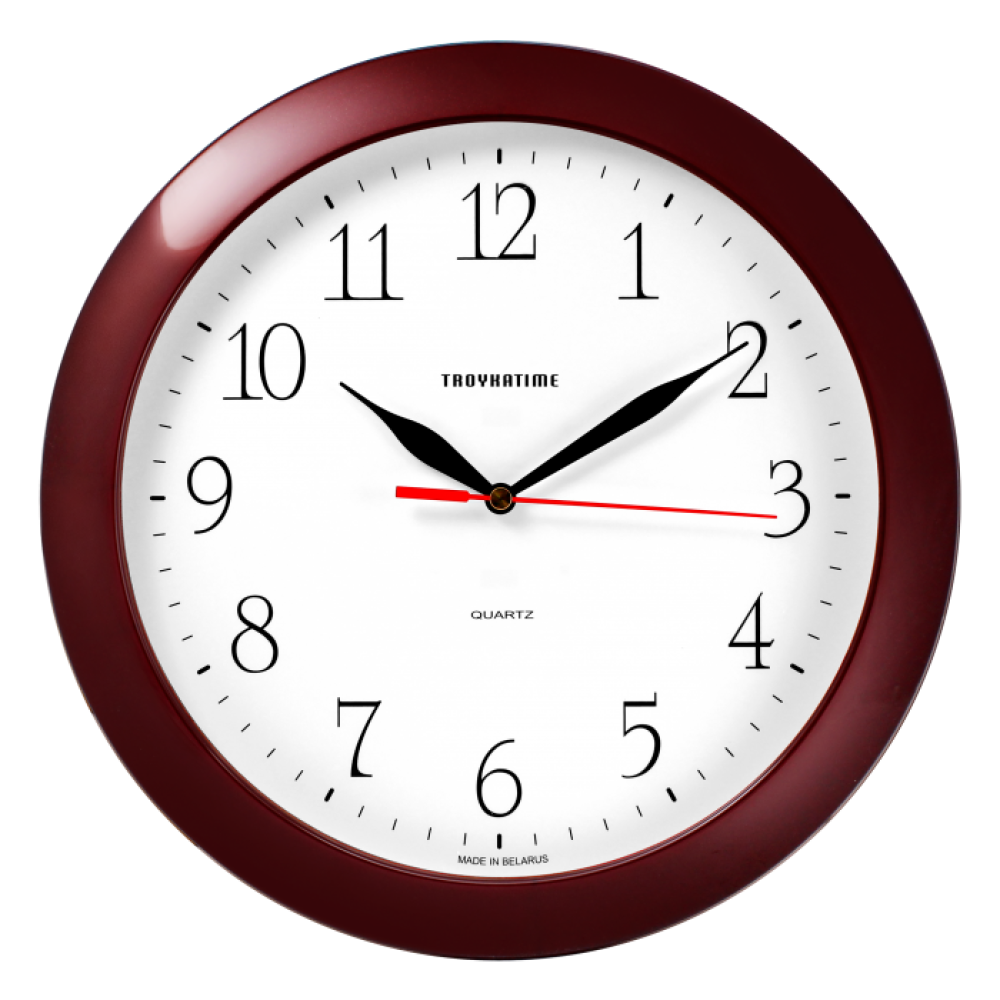 Классические настенные часы TROYKA 11131113 бордового цвета пластика. Циферблат с арабскими цифрами. Механизм с плавным ходом. Минеральное стекло.