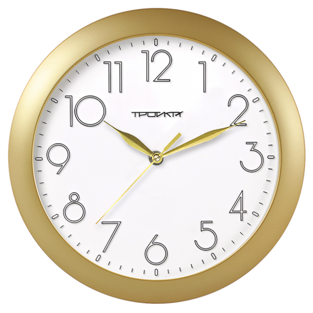 Классические настенные часы TROYKA 11110171 из золотистого пластика. Циферблат с арабскими цифрами. Механизм с плавным ходом. Минеральное стекло.