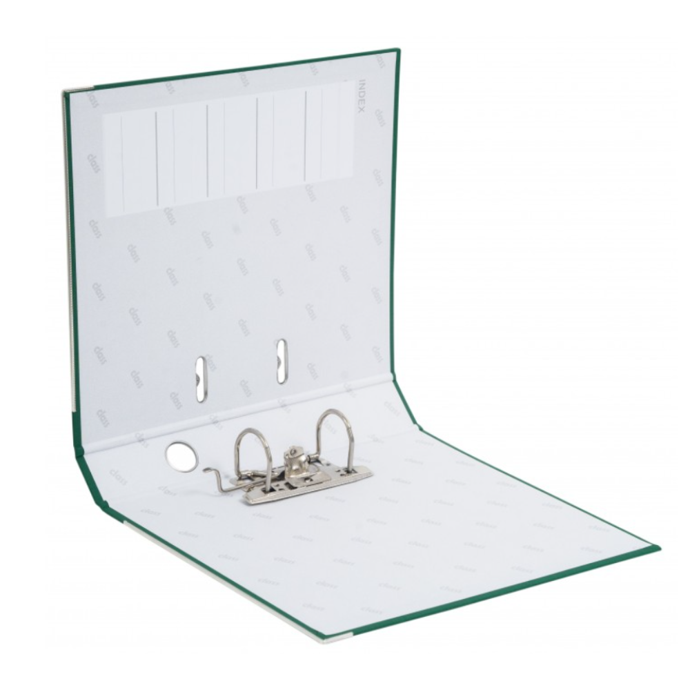 Папка-регистратор зеленого цвета с арочным механизмом высотой 50 мм. Папка изготовлена из прочного картона, покрыта износостойким ПВХ. Снабжен металлическими уголками, сменной этикеткой для подписи и удобным окошком для выемки с полки. Специальные прорези фиксируют папку в закрытом положении, предохраняя от непроизвольного открывания.