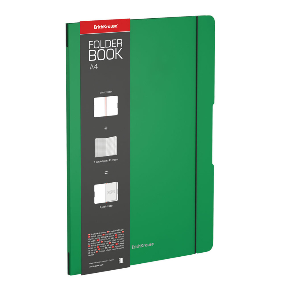 Тетрадь на резинке ErichKrause "FolderBook Classic". Тетрадь общая ученическая формата А4 (210x297 мм) со сменным блоком FB Solution в пластиковой обложке. В комплект входит одна тетрадь 48 листов на скобе в клетку. Удобная система крепления на резинке дает возможность быстрой замены тетрадей, а фиксирующая резинка предотвращает нежелательное раскрытие. Эргономичный дизайн: специальные выемки на обложке облегчают перелистывание. Обложка из высококачественного износостойкого матового пластика с фактурой «песок». Бумага офсетная плотностью 60 г/м2. Цвет линовки — синий. Скругленные уголки обложки и блока. Рекламный вкладыш с информацией о товаре. Тетради упакованы в пакет по 4 штуки. Сменные блоки FB Solution можно купить отдельно, но также для данной обложки подойдет любая тетрадь на скобе.