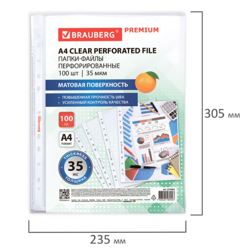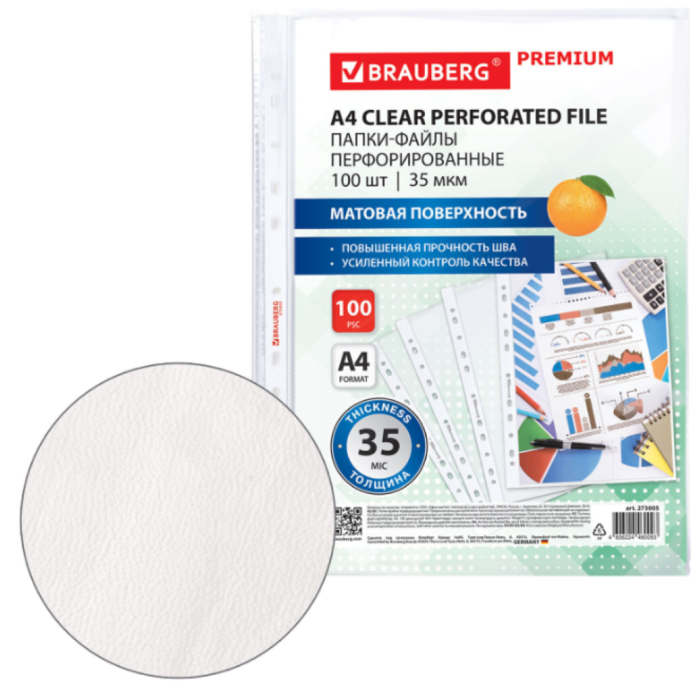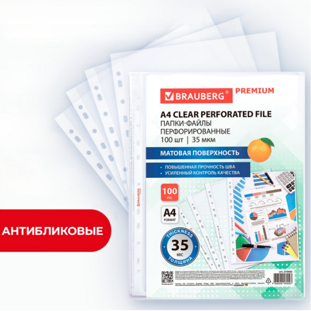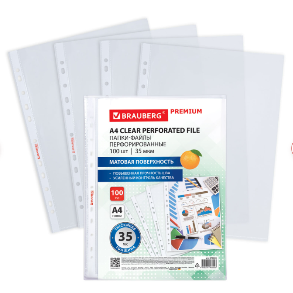 Перфорированные папки-файлы BRAUBERG предназначены для хранения и защиты бумажных документов от загрязнения и механических повреждений. Перфопапки формата А4 с вертикальным размещением и универсальной перфорацией имеют матовую поверхность и прочные швы. Файлы являются незаменимым атрибутом в офисе, позволяют систематизировать документы и обеспечивают их сохранность на долгое время. Изготовлены из прочной пленки толщиной 35 мкм. В комплект входит 100 перфопапок.