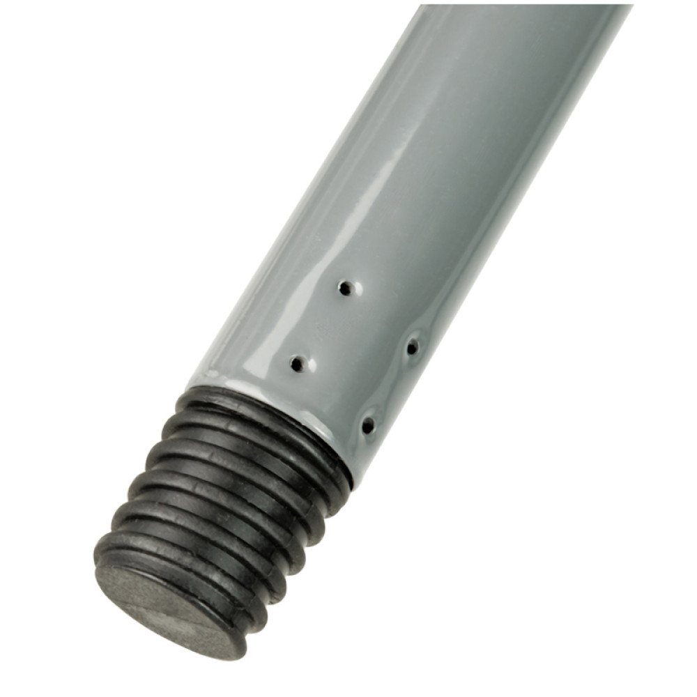 Черенок металлический OfficeClean для щеток с резьбой для установки в качестве рукоятки для уборочного инвентаря. Имеет пластиковый наконечник с отверстием для хранения в подвешенном состоянии на крючке.