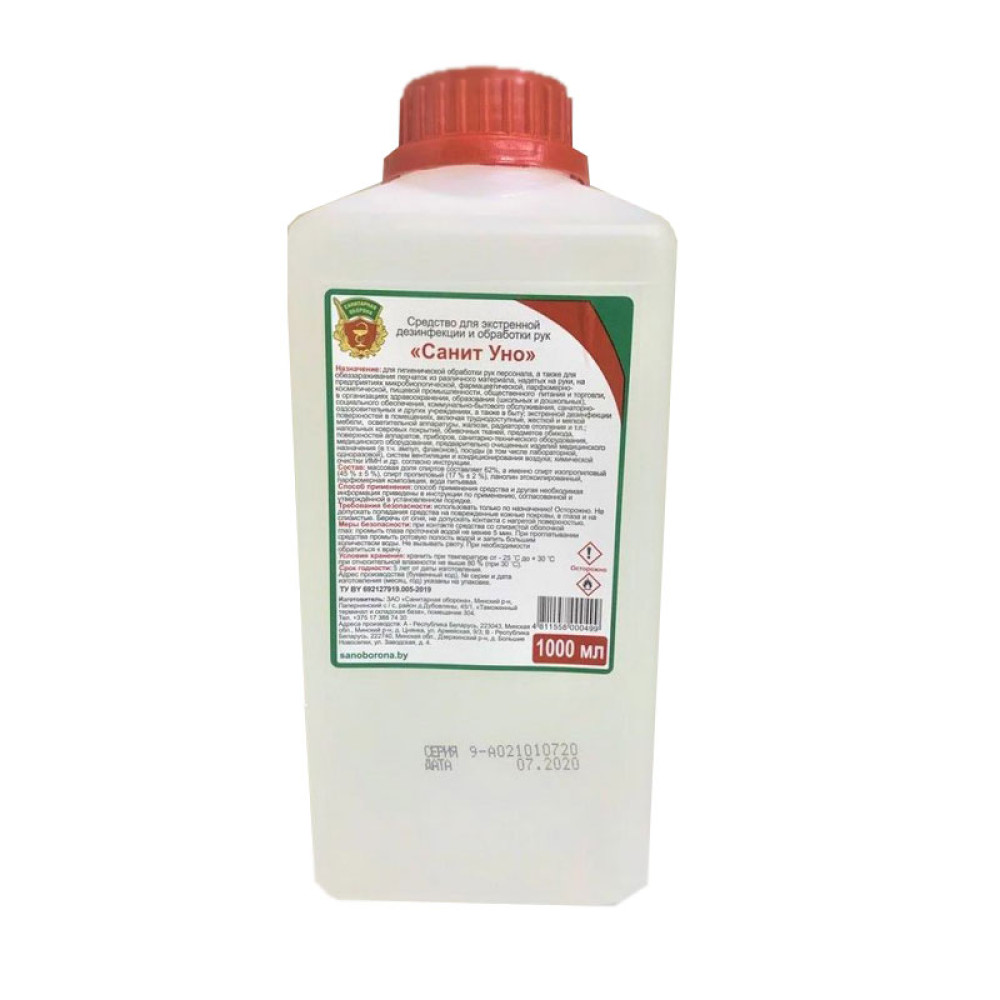 Спиртовое средство антисептическое Санит "Уно" для обработки рук. Состав: спирты 62% (изопропиловый 45%, пропиловый 17%). Средство обладает широким спектром антимикробного действия в отношении бактерий, грибов, вирусов (в т.ч. коронавирусов, аденовирусов, ECHO6 и пр), микобактерий туберкулёза. Смывание средства после обработки не требуется.