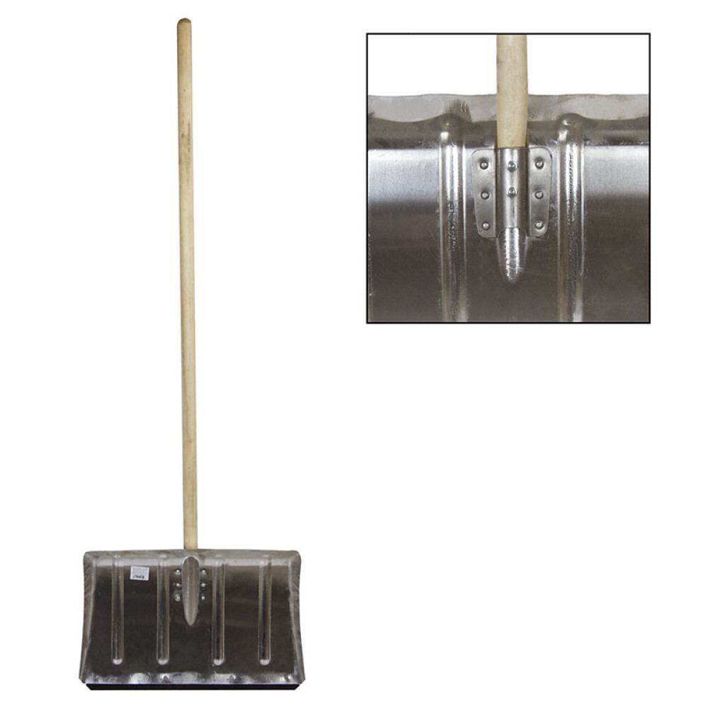 Лопата для уборки снега с деревянным черенком для очистки площадок, тротуаров, дорог от снега. Снегоуборочная алюминиевая лопата с деревянным черенком имеет относительно небольшой вес - 1,8 кг - благодаря легкости металла, поэтому выполнять уборочные работы с ее помощью могут как мужчины, так и женщины. Рабочая часть выполнена из легкого прочного и упругого алюминия. Лопата для уборки снега, усиленная четырьмя специальными ребрами жесткости, расположенными симметрично по поверхности углубленного ковша, эффективна для взаимодействия со снежными или сыпучими массами. Такое решение позволяет выдерживать значительные объемы снега или других материалов и не прогибаться под их нагрузкой. Снеговая алюминиевая лопата представлена с деревянным черенком, тщательно обработанным и очищенным от нежелательных неровностей и сучков.