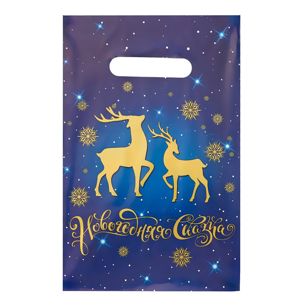 Пакет с прорезной ручкой Новогодняя сказка. Полиэтиленовый пакет с вырубными ручками - это удобная и прочная упаковка из полиэтилена с отверстиями для ручек, которая предназначена для переноски товаров. Этот пакет легкий, надежный и прост в использовании, идеально подходит для покупок, хранения и транспортировки различных предметов.