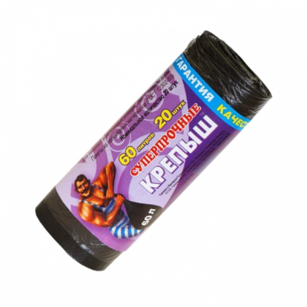 Двадцать пакетов для мусора особой прочности «Крепыш» объемом по 60 л в рулоне.