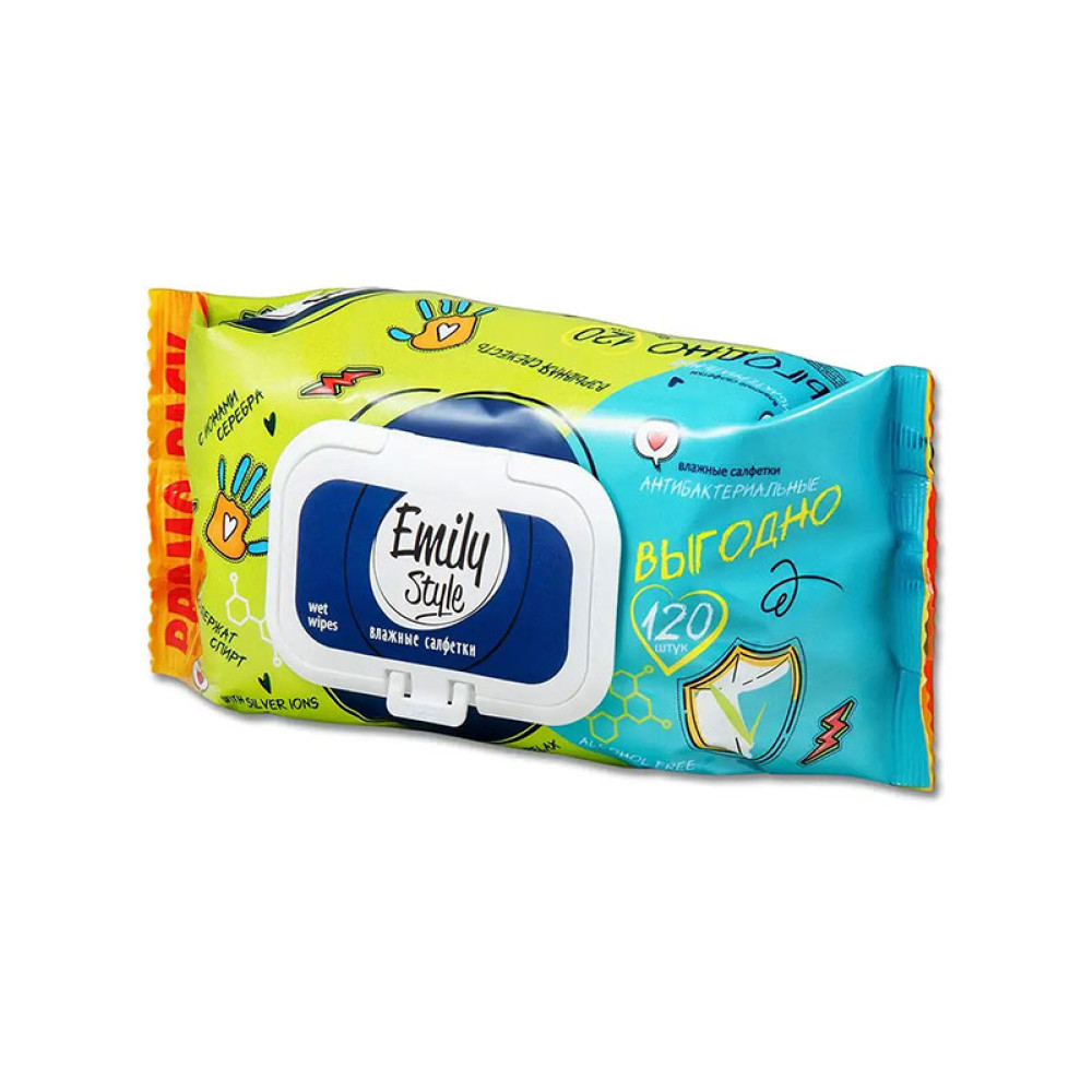 Салфетки антибактериальные, влажные Emily Style с клапаном, пакет с клапаном 120 шт.. Салфетки влажные универсальные Emily Style «Антибактериальные» обладают антибактериальной активностью в отношении грамположительных и грамотрицательных микроорганизмов. Обеспечивают чистоту и защиту каждый день. Содержат деминерализованную воду с ионами серебра. Очищают руки и обеспечивают защиту от бактерий до 100% каждый день.