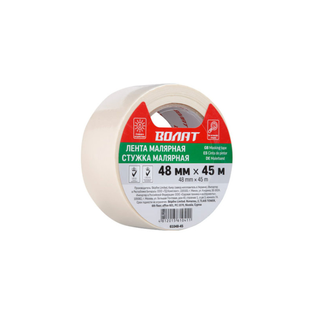 Скотч бумажный Волат или малярная лента. Защищает поверхности от краски, пыли при ремонтных и малярных работах; для защиты стеклянных, пластиковых и металлических поверхностей от царапин и сколов; при окрашивании автомобилей; в быту для заклеивания щелей в окнах. Устойчив к действию красок, лаков, грунтовок. Не оставляет следов при удалении.