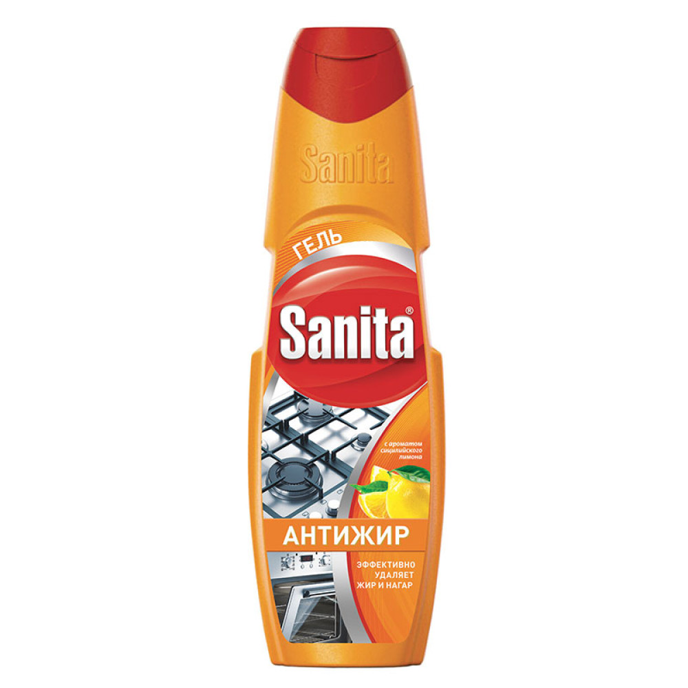 Средство чистящее для плит Санита Гель "Антижир". Эффективное средство для удаления жировых загрязнений с кухонных плит, духовых шкафов, пластиковых панелей и керамических плит. Обеспечивает чистоту и сияние.