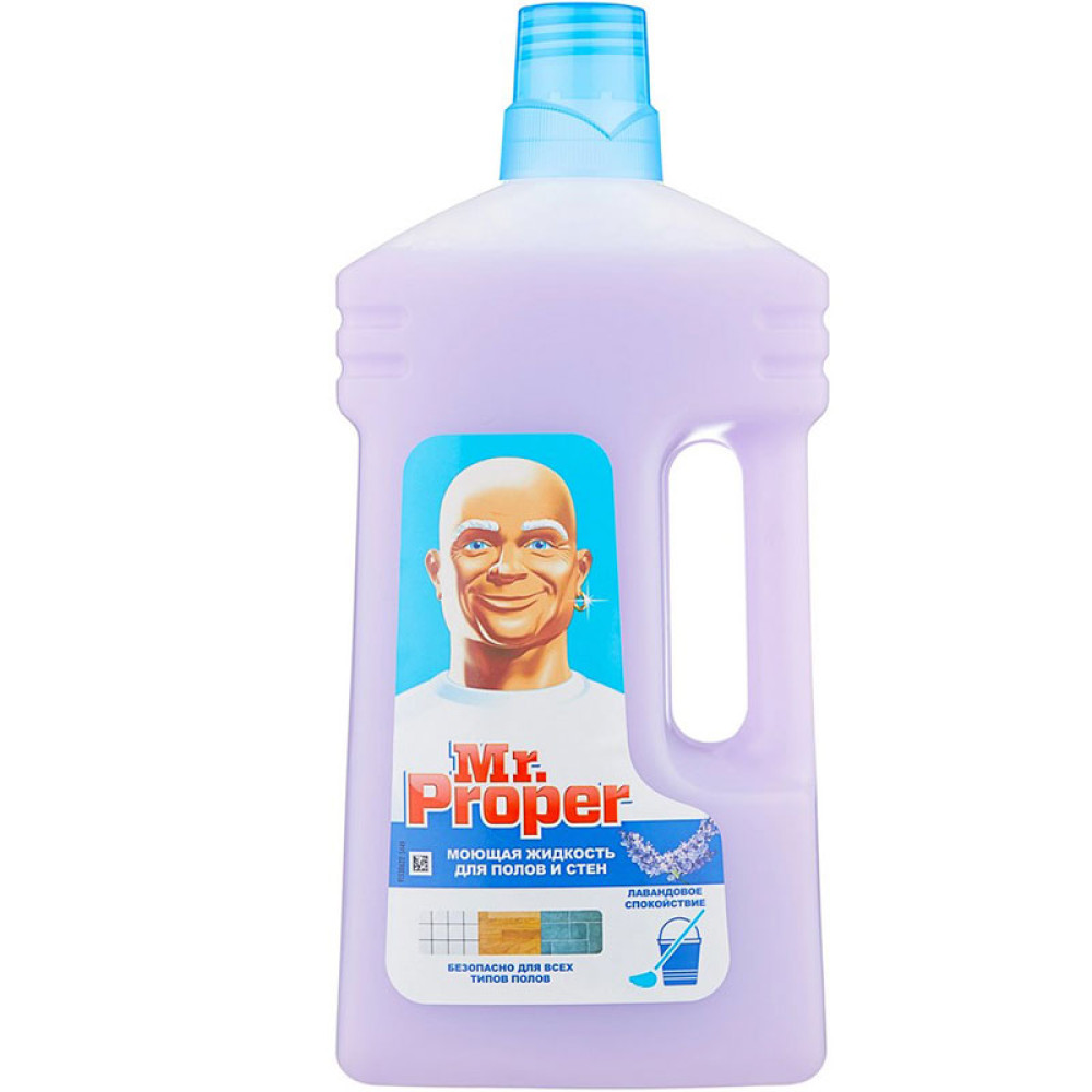 Средство чистящее универсальное Mr. Proper. Универсальная моющая жидкость для полов и стен Mr. Proper с ароматом лаванды эффективно очистит кафель, ламинат, паркет и другие твердые поверхности в вашем доме. Средство легко удалит любые загрязнения и не оставит разводов. Удаляет грязь на 100% и отмывает даже в холодной воде, избавляет от неприятных запахов. Не требует смывания при условии, что поверхности не соприкасаются с пищевыми поверхностями. Средство подходит для обработки любых поверхностей ванной, гостиной, кухни. Чтобы начать уборку, разведите два колпачка раствора Mr. Proper Лавандовое спокойствие в пяти литрах теплой воды.