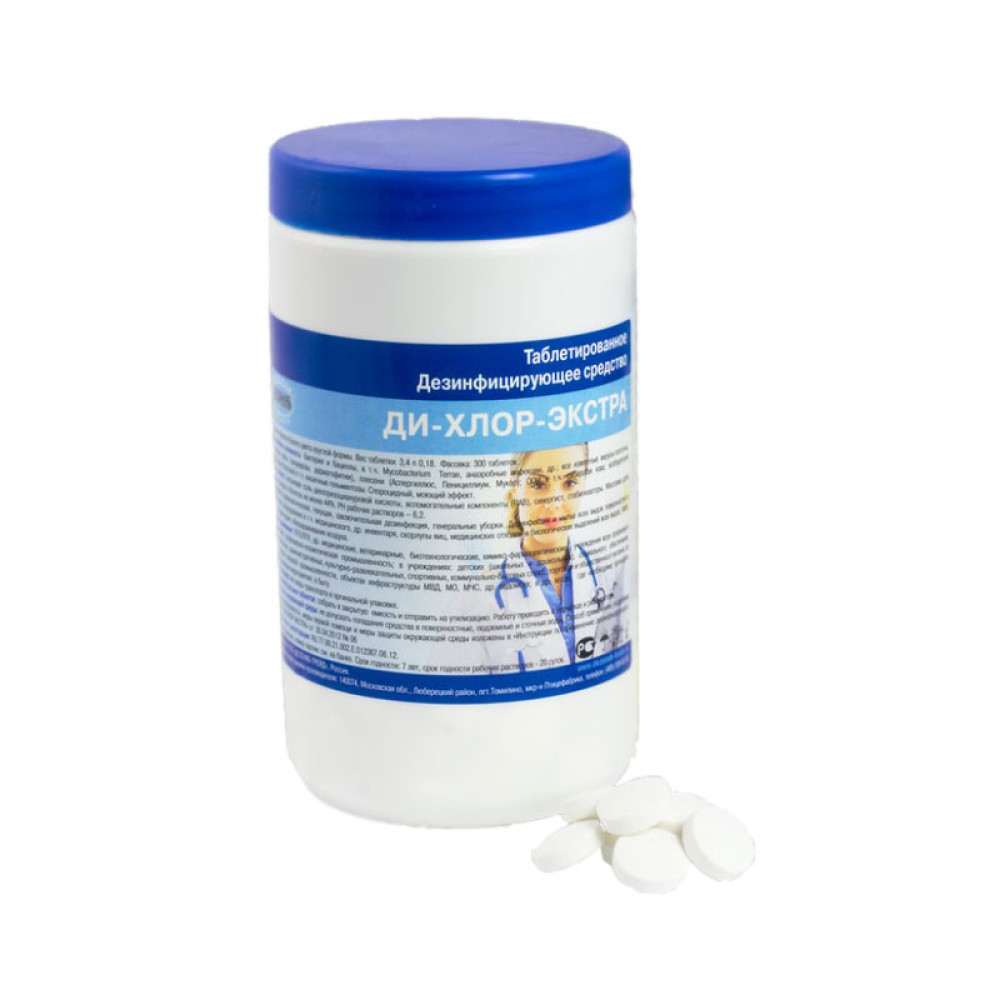 Средство дезинфицирующее Ди-Хлор-Экстра в хлорсодержащих таблетках. Хорошо растворяется в воде. Средство предназначено на дезинфекции поверхностей, сантехоборудования, уборочного инвентаря,