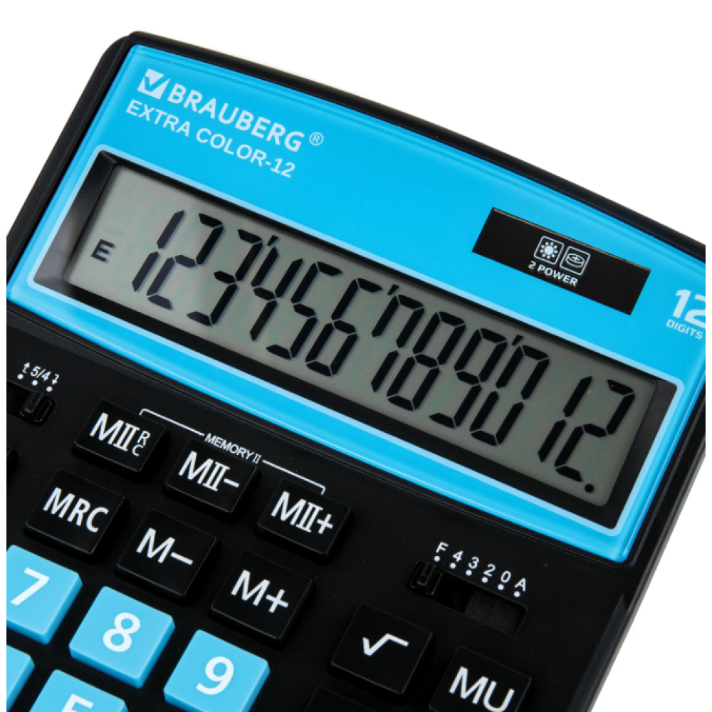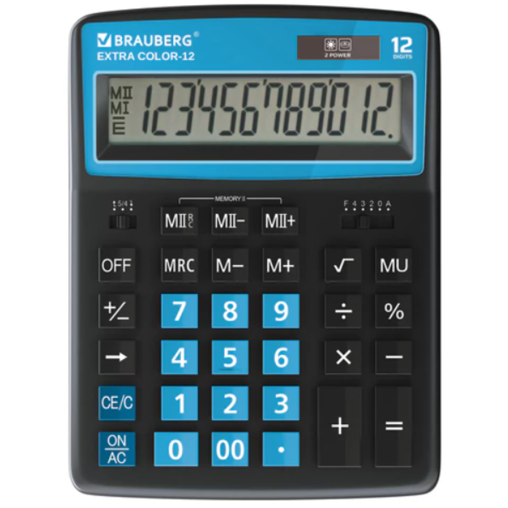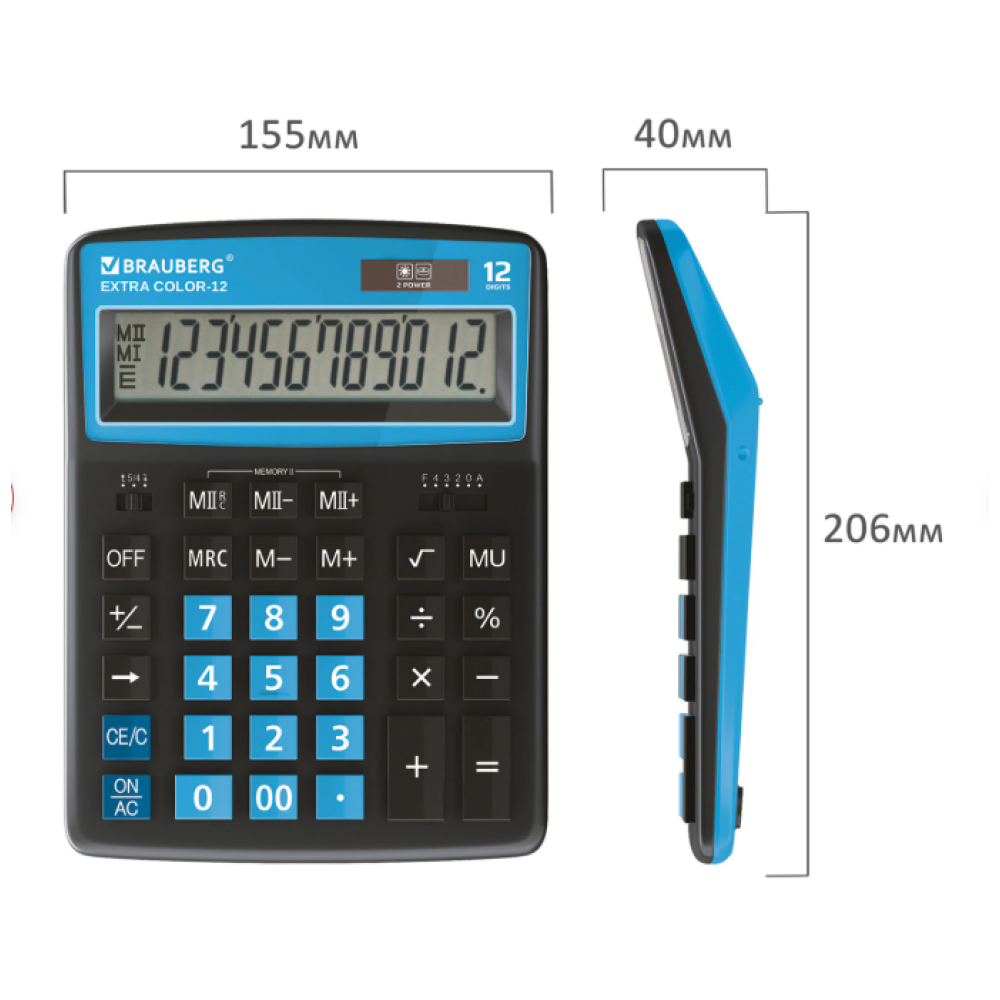 Настольный калькулятор BRAUBERG EXTRA COLOR-12-BKBU. Большой дисплей с увеличенным углом обзора, устойчивый корпус и клавиатура с цветной дифференциацией для эффективной работы с максимальным комфортом. Калькулятор производит все основные арифметические действия: возведение в степень, вычисления с процентами, извлечение квадратного корня. Незаменим для бухгалтеров благодаря наличию клавиш двойной памяти, «00» и MU для расчетов налогов и торговой наценки. Переключатели округления и положения десятичного знака позволяют производить нужные настройки. Большой двенадцатиразрядный дисплей отображает большие значения с высокой точностью округления. Встроенный аккумулятор и солнечная батарея позволяют калькулятору работать при любом освещении, а клавиша выключения OFF и функция автоматического отключения (через 8-10 минут бездействия) позволяют максимально продлить срок его службы без замены батареи. Размер - 206x155 мм.