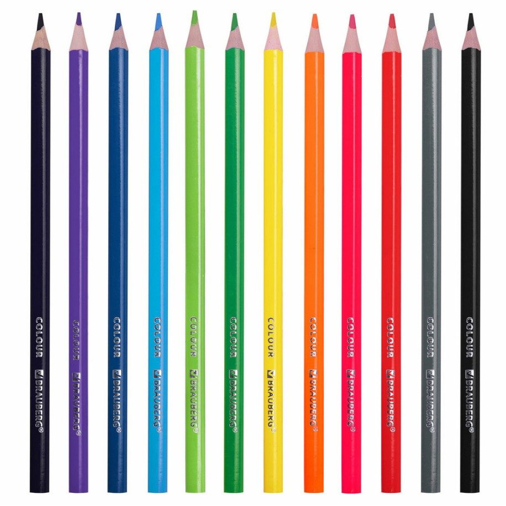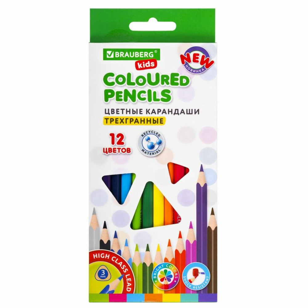 Набор цветных карандашей Brauberg "Kids" незаменимы для обучения рисованию и развития творческих способностей ребенка. Особое качество красящего пигмента обеспечивает насыщенные, яркие цвета. Набор состоит из 12 цветов: черный, синий, голубой, салатовый, зеленый, желтый, оранжевый, розовый, красный, серый, фиолетовый, коричневый. Ребёнок будет рисовать легко и с удовольствием благодаря эргономичной трехгранной форме корпуса карандашей. Корпус карандаша изготовлен из переработанного eco-friendly пластика, который гарантирует легкую и плавную заточку. Яркий лакированный корпус карандашей выполнен в цвет грифеля. Грифель насыщенного цвета диаметром 3 мм обладает повышенной прочностью и мягкостью. Карандаши заточены и упакованы в качественную картонную коробку с европодвесом.