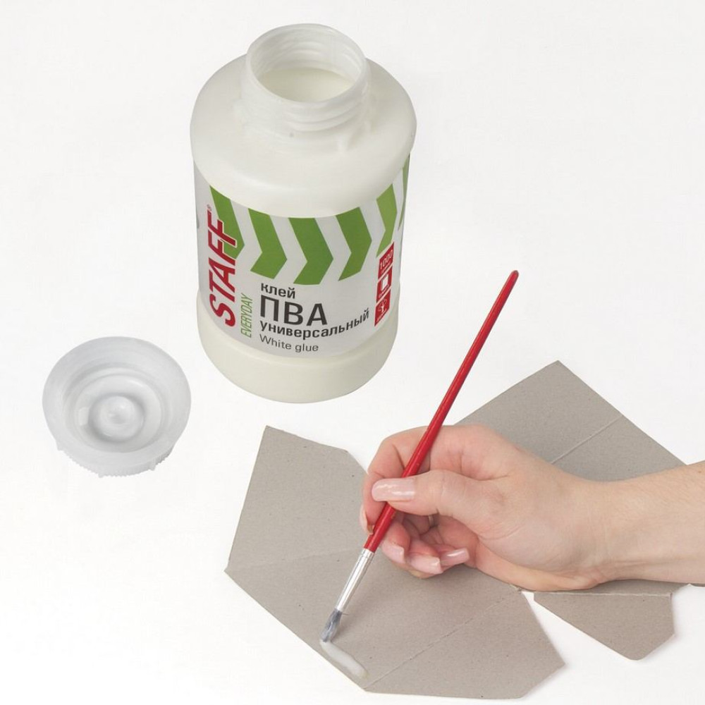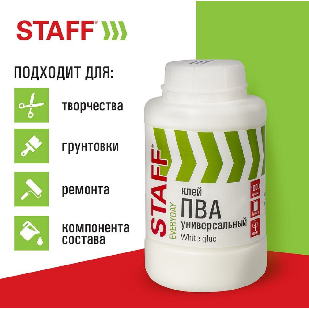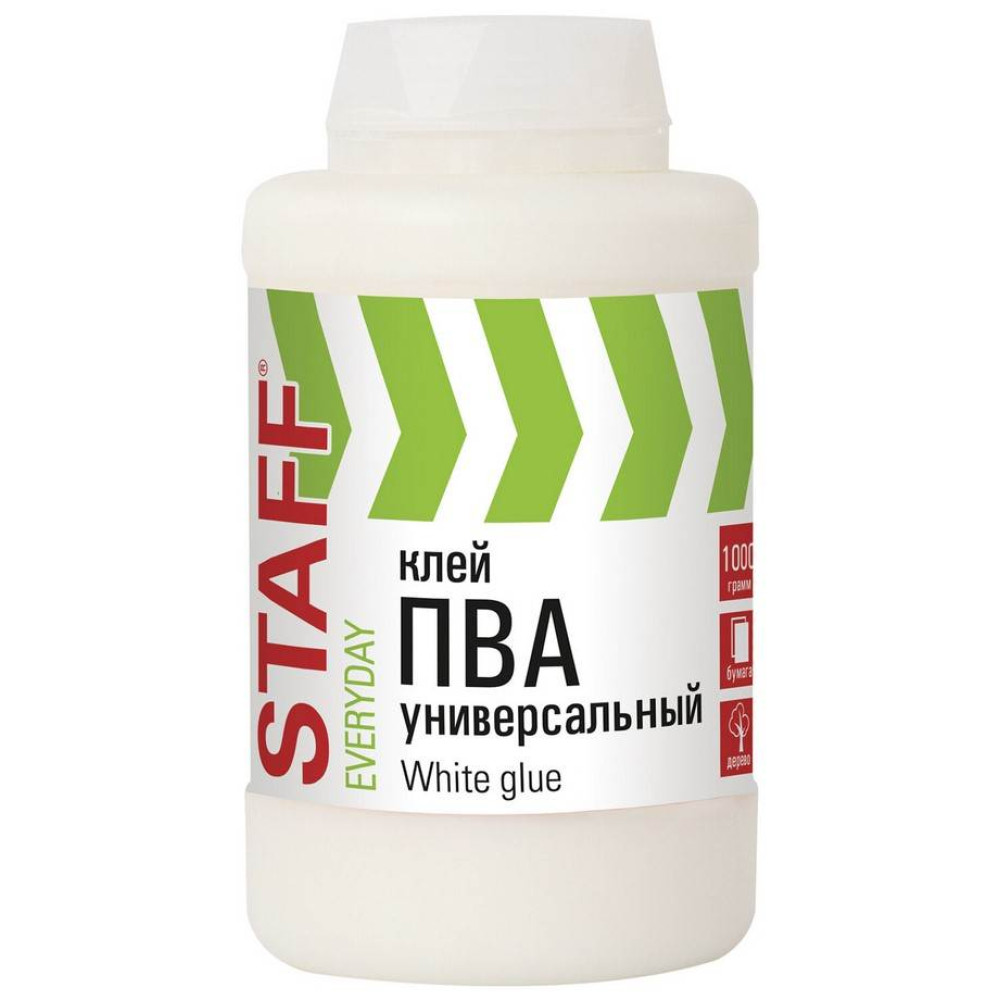 Клей универсальный ПВА Staff для изделий из бумаги, картона, тканей, виниловых и бумажных обоев. Может использоваться в качестве модификатора для улучшения технологических и адгезионных свойств. Имеет вес 1 кг. Произведен из сырья высокого качества. Обладает устойчивостью к морозу, не токсичен. Наносится тонким слоем, обеспечивая быстрое схватывание поверхностей, а также экономичное расходование. Необходимо взболтать перед применением. Класс водостойкости D2.