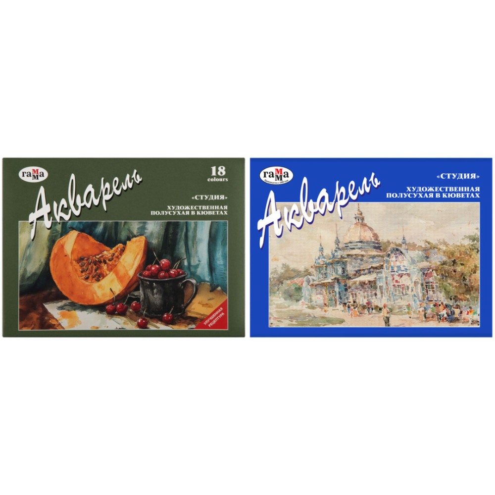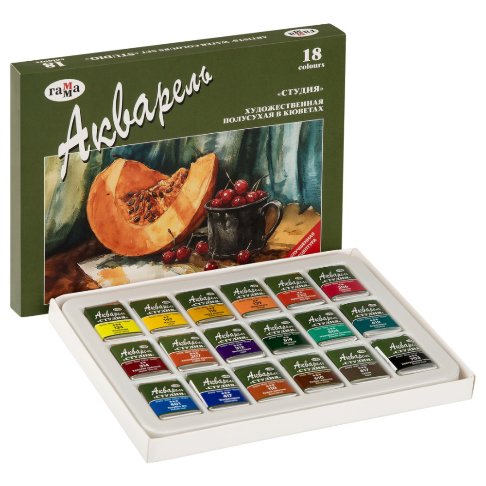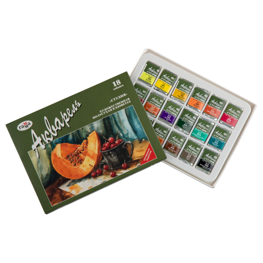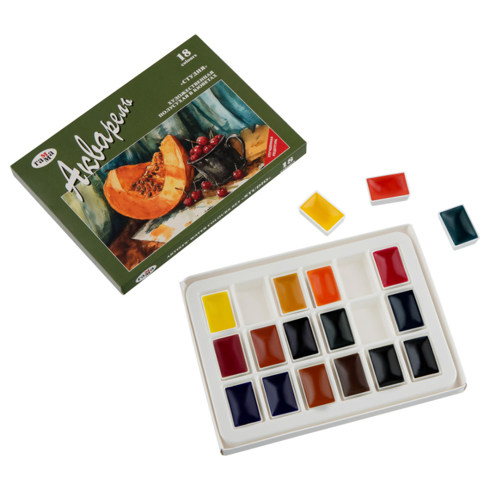 Акварель художественная Гамма "Студия" изготовлены на основе гуммиарабика. Полусухая акварель сушится при температуре не выше 40 °C, что позволяет сохранить яркость и свежесть краски. После высыхания она становится матовой. Цвета легко смешиваются между собой, прекрасно размываются и легко набираются из кюветы. Набор из 18 цветов акварельных красок идеально подойдёт для начинающих художников и студентов художественных училищ.