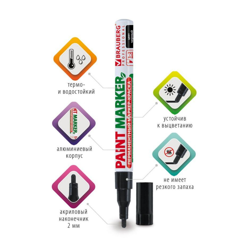 Маркер-краска лаковый Brauberg "Professional" для маркировки различных материалов в промышленных условиях: бетона, дерева, стекла, металла, резины, пластика. Также подходит для творчества и декорирования. Чернила с лаковым эффектом не содержат ксилол, являясь экологичными и безопасными для окружающей среды. Не имеют резкого запаха нитро-краски в отличие от большинства аналогов, что позволяет использовать данный маркер в закрытых помещениях без вреда для здоровья. Отличаются термо- и водостойкостью, устойчивы к выцветанию. Пишет по сухим, жирным, грязным, ржавым поверхностям. Ширина линии письма составляет 1-2 мм. Прочный круглый наконечник выполнен из пористого акрила. Алюминиевый корпус. Способ применения: 1. Перед использованием хорошо встряхнуть с закрытым колпачком. 2. Снять колпачок, нажать несколько раз на наконечник, пока не появится краска.
