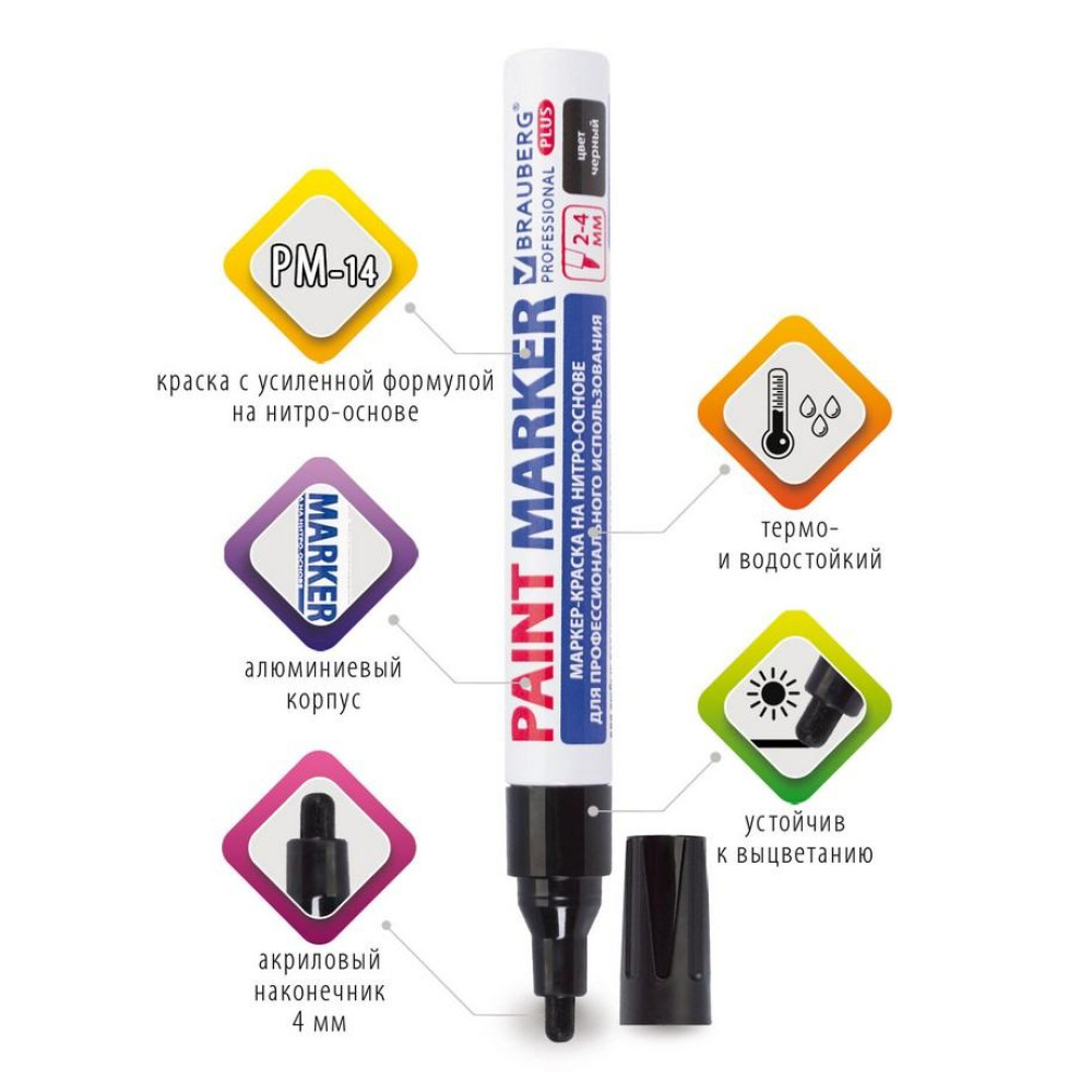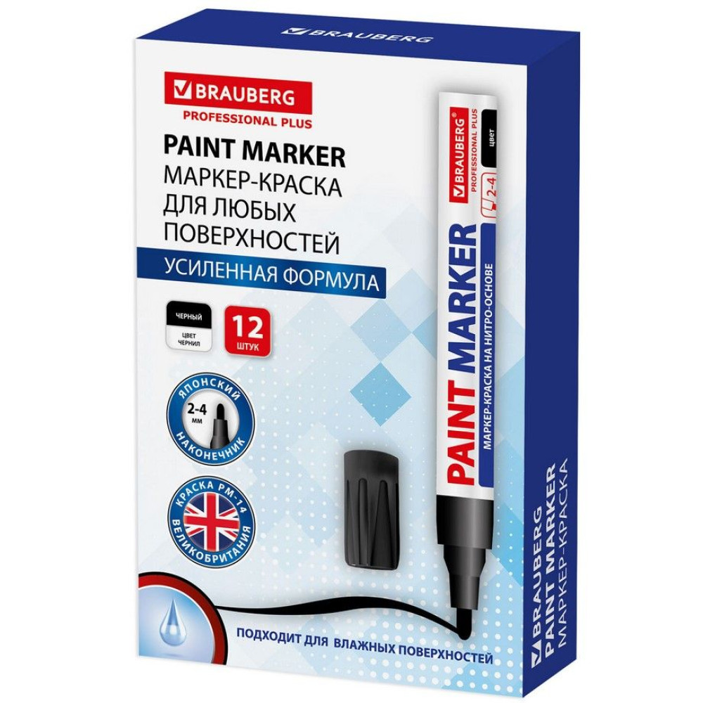 Маркер-краска с нитро-основой Brauberg "Professional Plus" для маркировки различных материалов в промышленных условиях: бетона, дерева, стекла, металла, резины, пластика. Заправлен краской с усиленной формулой на нитро-основе РМ-14. Чернила с лаковым эффектом являются экологичными и безопасными для окружающей среды. Благодаря усиленной формуле идеально подходят для нанесения долговечной маркировки на любых поверхностях, включая влажные. Отличаются термо- и водостойкостью, устойчивы к выцветанию. Пишет по сухим, жирным, грязным, ржавым и влажным поверхностям. Ширина линии письма составляет 2-4 мм. Прочный круглый наконечник выполнен из пористого акрила. Алюминиевый корпус.
