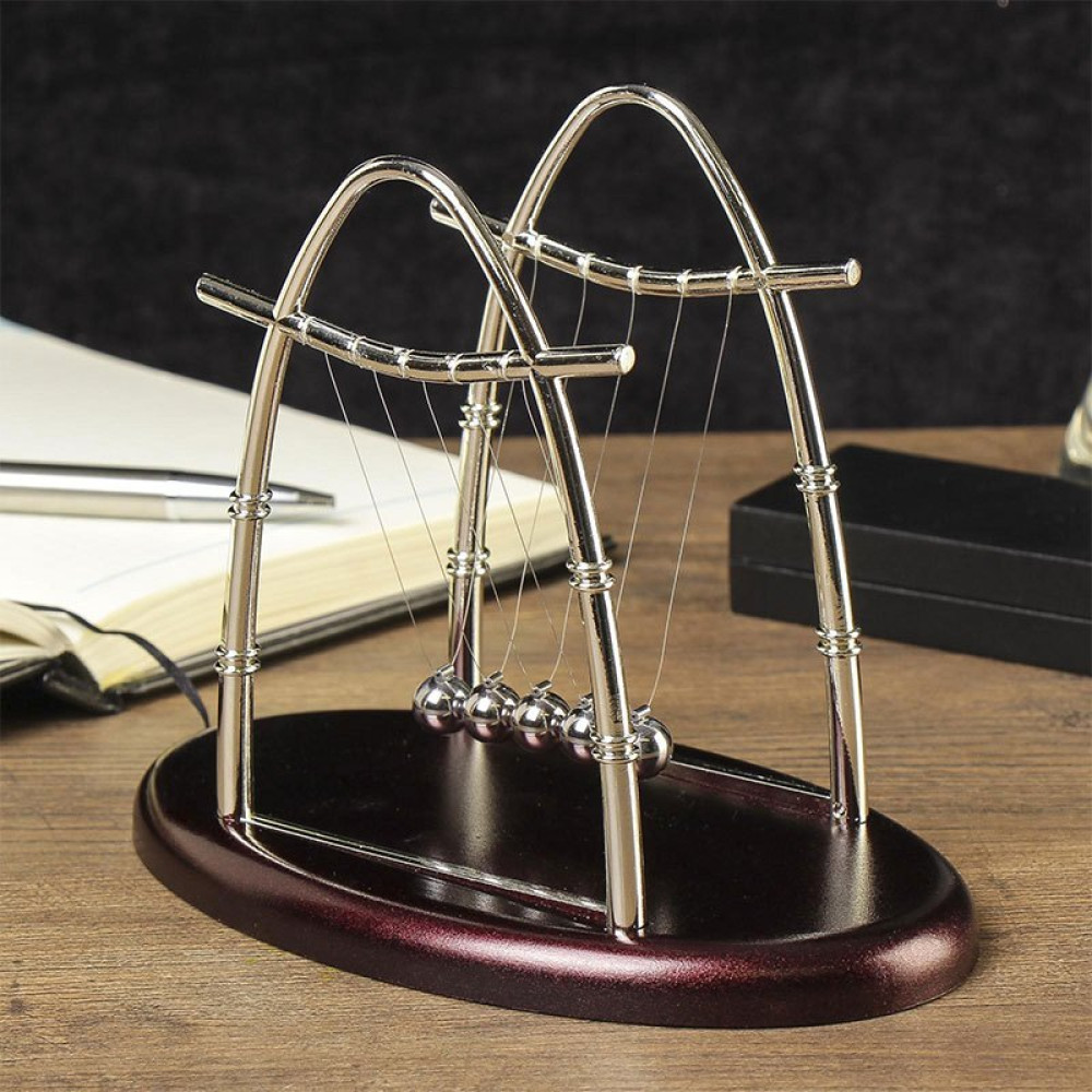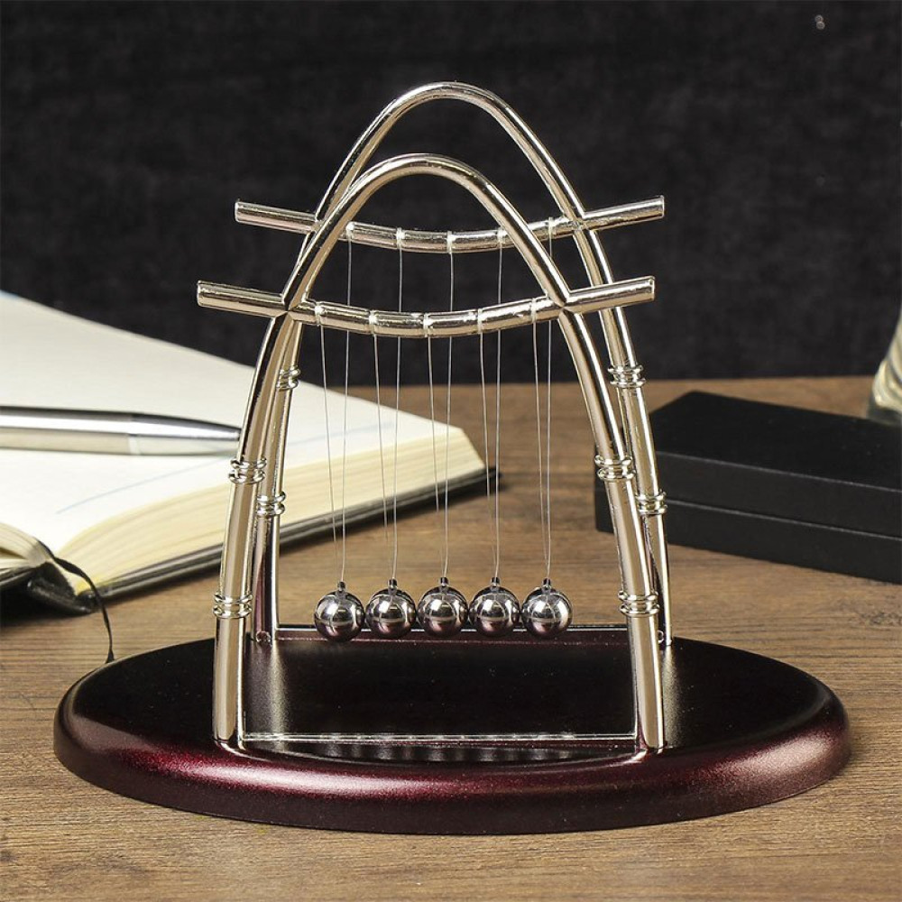 Маятник настольный антистресс "Шары Ньютона. Колыбель техно овал" - небольшая настольная кинетическая скульптура в собранном виде демонстрирует закон сохранения энергии, открытый Исааком Ньютоном. Завораживающее медитативное постукивание блестящих шаров на Вашем столе поможет сосредоточиться при обдумывании. Система состоит из подставки и пяти металлических шариков, которые подвешены на леске. Для активации маятника вам необходимо отвести один шарик в сторону и отпустить его. Продолжительность движения зависит от размера и веса шариков: чем тяжелее и больше шарики, тем дольше процесс, и наоборот.