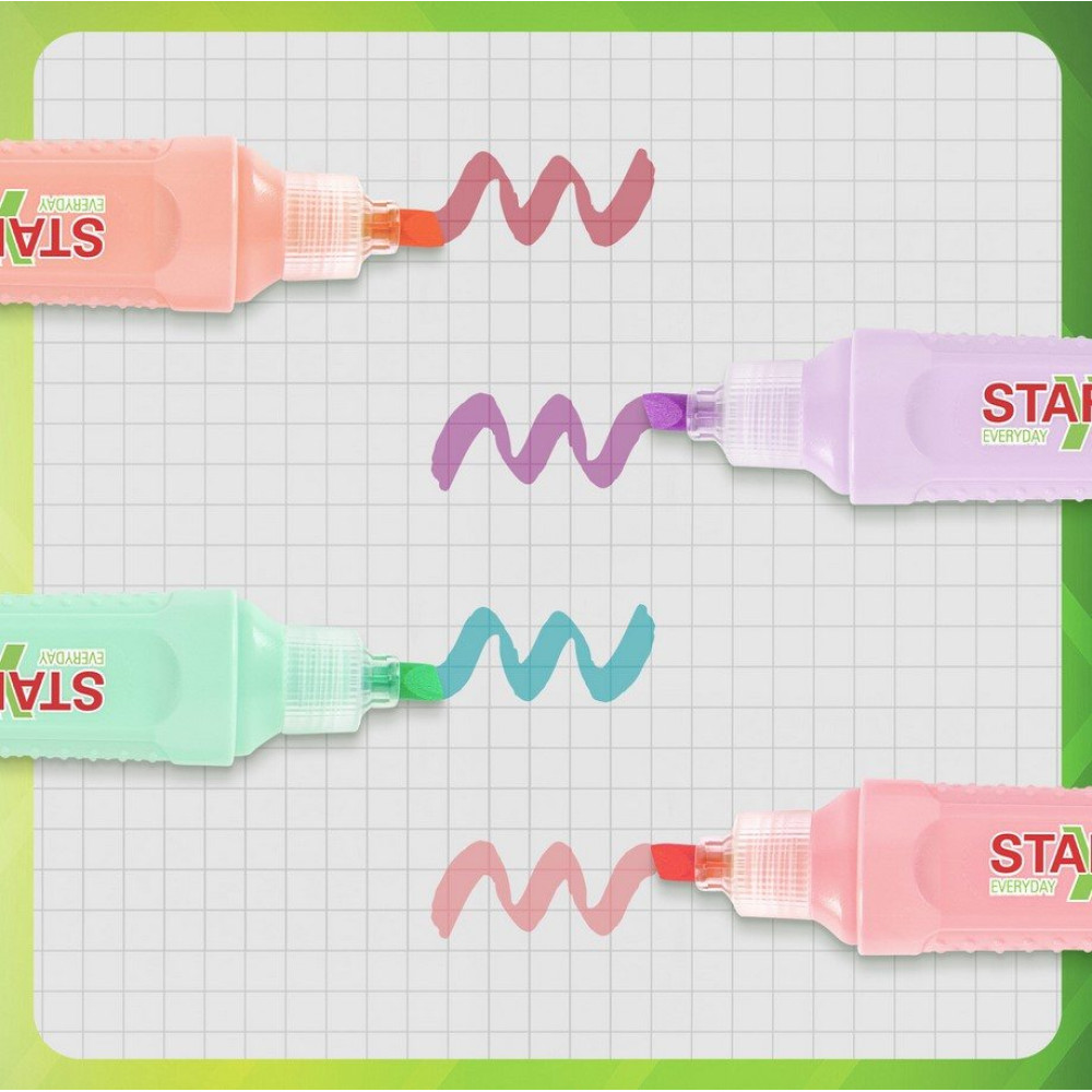 Набор текстовыделителей Staff "Everyday HL-707 " 4 неоновых цвета в наборе: мятный, лавандовый, пастельный розовый и персиковый. Скошенный наконечник имеет толщину линии письма от 1 до 5 мм - широкая часть удобна для выделения текста, а тонкая – для подчеркивания. Светоустойчивые чернила не выцветают даже на открытом солнце. Чернила на водной основе быстро сохнут и не оставляют разводов. Цвет корпуса соответствует цвету чернил.