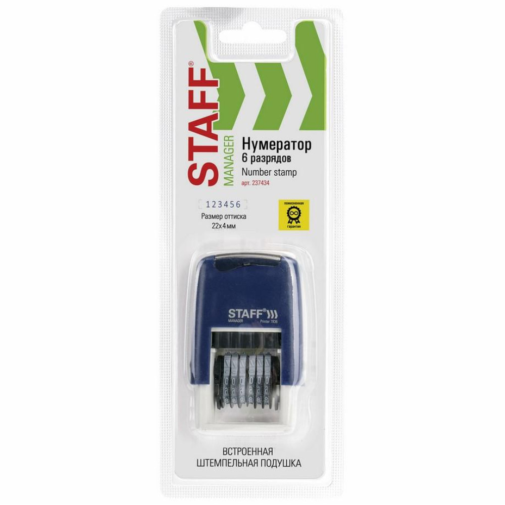Нумератор Staff "Printer 7836" предназначен для создания оттиска номера из 6 разрядов, что позволяет существенно экономить рабочее время при нанесении необходимых отметок на документы. Клише штампа оставляет оттиск размером 22*4 мм синего цвета. Изменение номера осуществляется вращением колесиков. Корпус изготовлен из качественного износоустойчивого пластика. Верхняя часть корпуса выполнена в темно-синем цвете, а нижняя часть - в светло-сером. Надежные фиксаторы, располагающиеся по бокам, позволяют удерживать подвижную часть штампа в статичном положении. В специальном прозрачном окне на верхней части корпуса располагается образец текста для его идентификации в процессе использования штампа. Замена подушки не составляет труда. На механизм распространяется пожизненная гарантия. В состав комплекта входят: пластиковый нумератор, сменная штемпельная подушка.