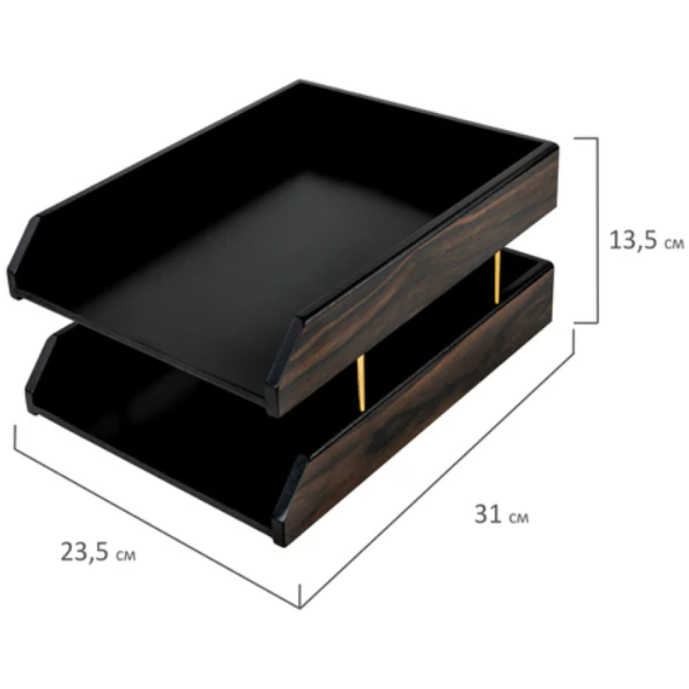 Настольный набор премиум-класса GALANT "Blackwood" - оригинальный подарок, отличающийся утонченным стилем и совершенством деталей. Идеально подойдет в качестве статусного подарка руководителю, бизнес-партнеру, коллеге по работе. Набор состоит из 9 предметов: - два лотка (для бумаг формата А4), которые можно соединить в один двойной; - коврик для письма (размер 66,5х43,5 см); - подставка для ручек (2 шариковые ручки с синими чернилами в комплекте); - стакан-подставка для письменных принадлежностей; - подставка для бумажного блока; - подставка для визиток; - подставка для конвертов; - нож для вскрытия конвертов. Все предметы изготовлены из дерева черного цвета.