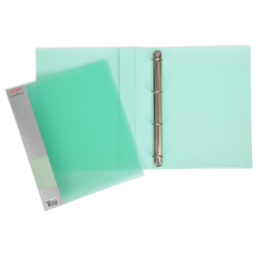 Папка на 4 кольцах Diamond полупрозрачного зеленого цвета, изготовленная из плотного (0,7 мм) пластика с фактурной поверхностью. Ширина корешка 40 мм.