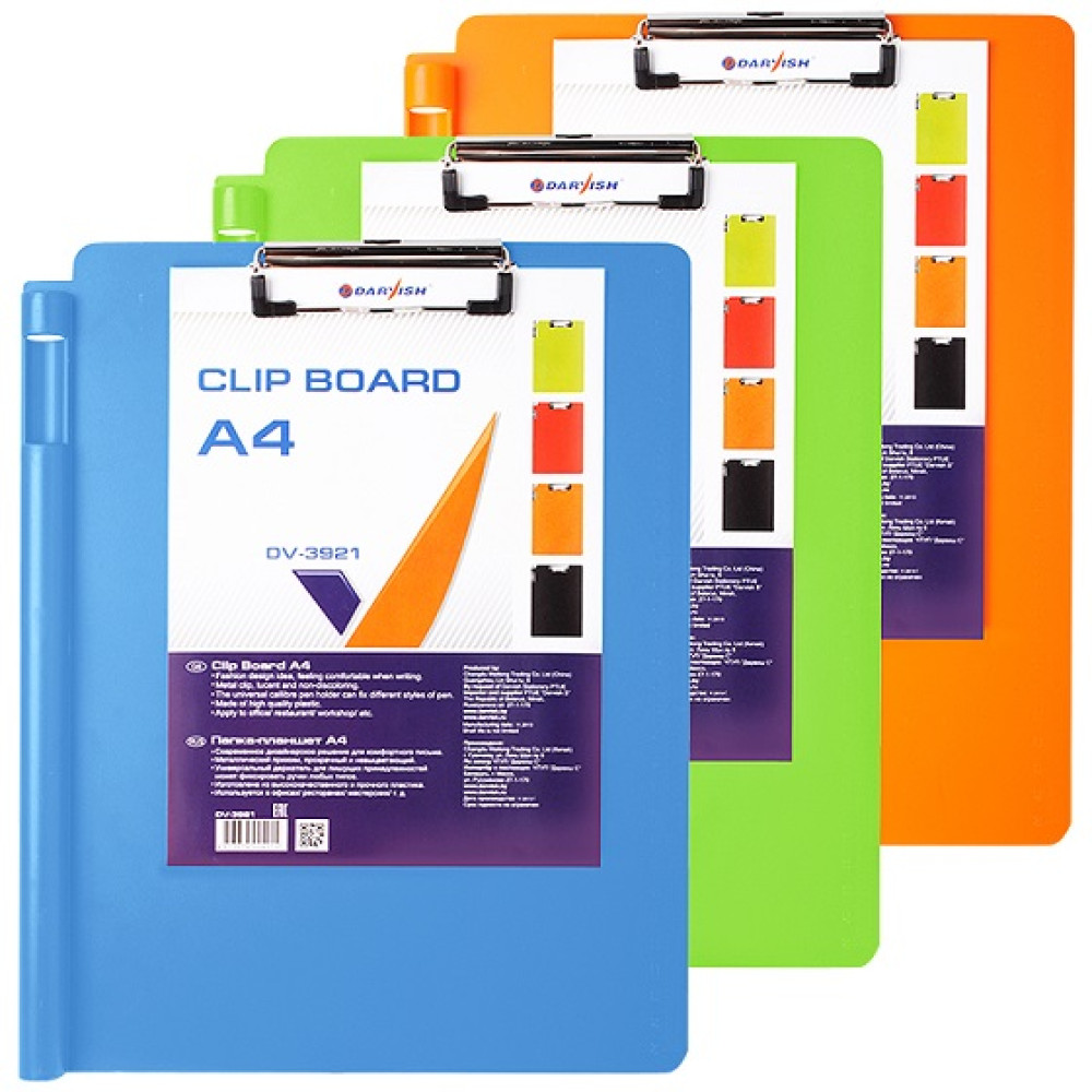 Пластиковый планшет с металлическим зажимом сверху надежно фиксирует документы. Есть специальный держатель для пишущих принадлежностей. Формат А4. Цвет ассорти.