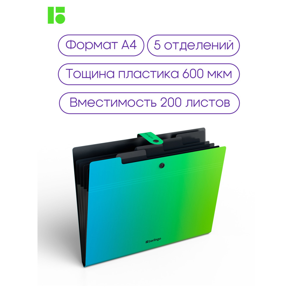 Папка-конверт на кнопке Berlingo "Radiance" имеет 5 отделений. Каждое отделение с индексным полем, позволяет сортировать документы по темам или алфавиту. Надежная застежка-кнопка черного цвета. Вмещает до 200 листов.