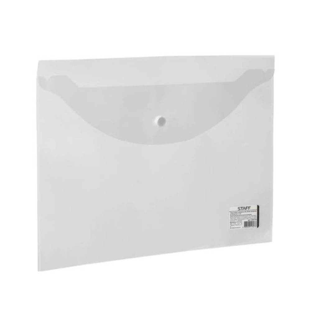Прозрачная папка-конверт Staff прозрачного цвета для документов формата А4. Папка изготовлена из плотного пластика толщиной 120 мкм. Папка закрывается клапаном на кнопку и