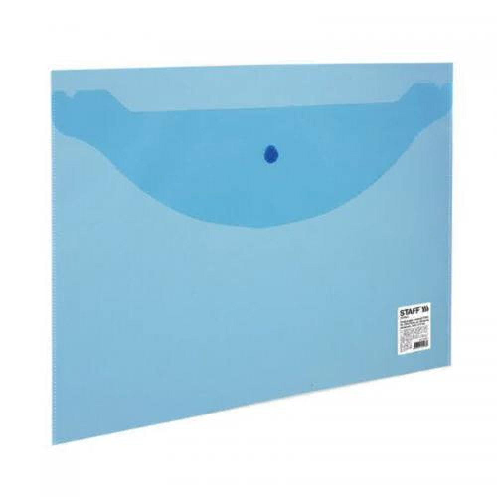 Прозрачная папка-конверт Staff синего цвета для документов формата А4. Папка изготовлена из плотного пластика толщиной 120 мкм. Папка закрывается клапаном на кнопку и