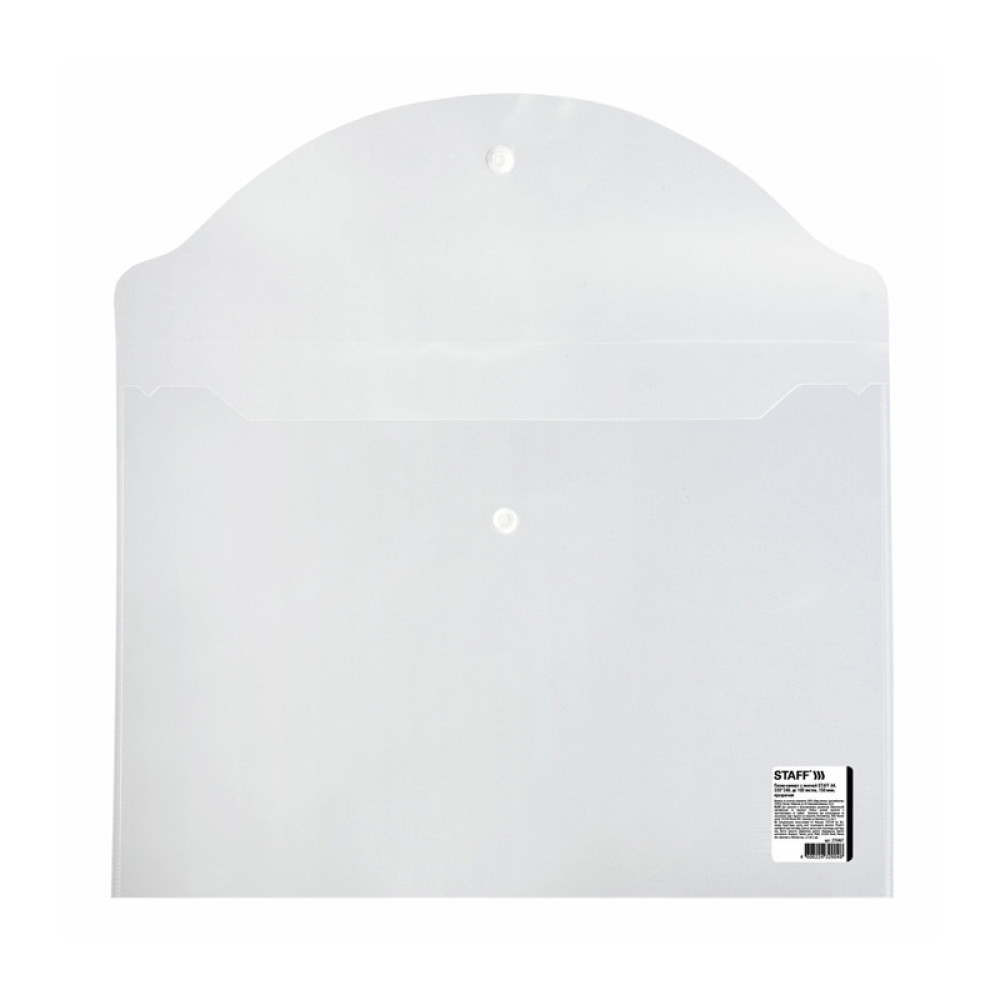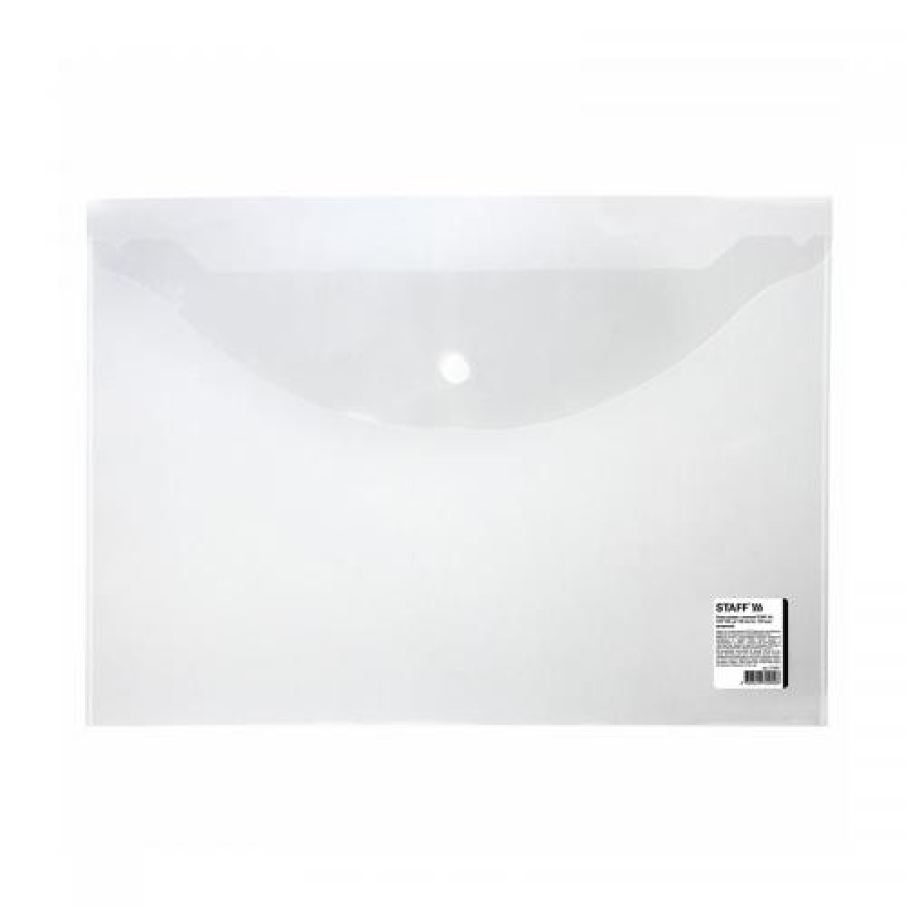 Полупрозрачная папка-конверт Staff прозрачного цвета для документов формата А4. Папка изготовлена из плотного пластика толщиной 150 мкм. Папка закрывается клапаном на кнопку и