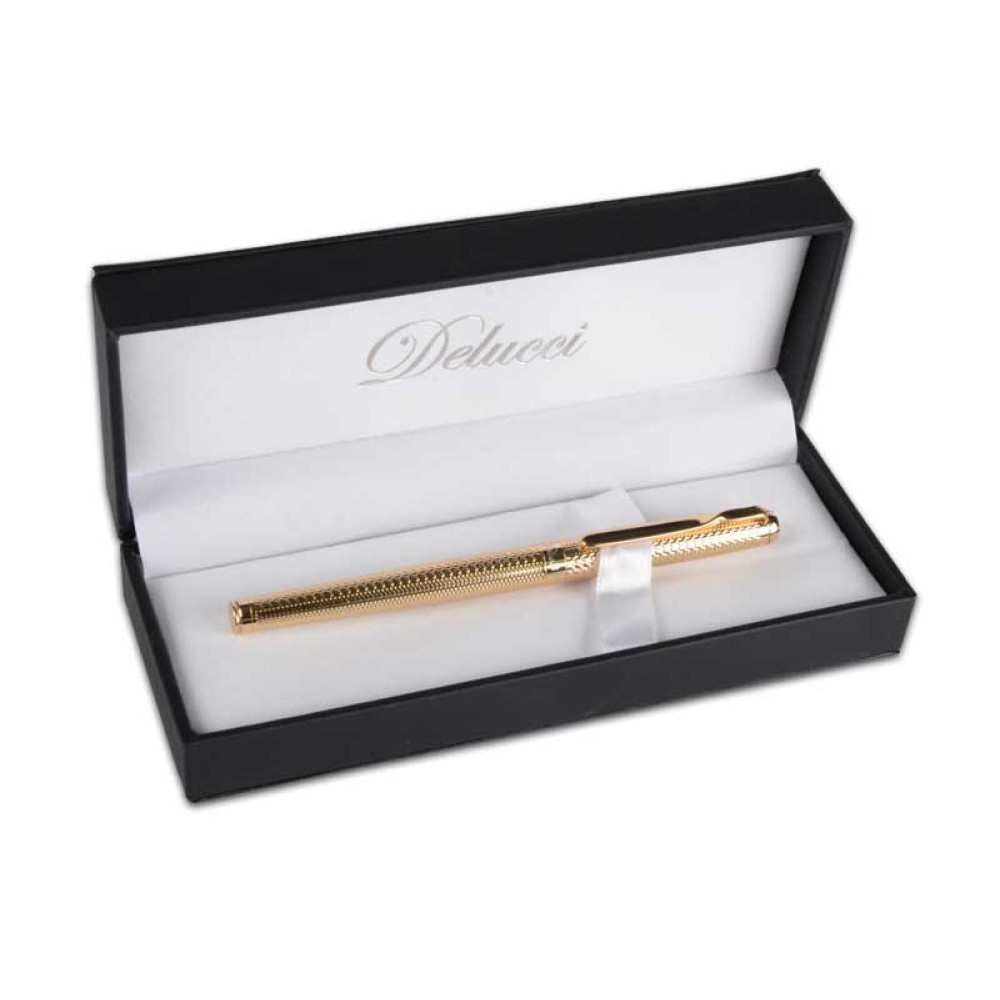 Изящная ручка-перо Delucci подарочная выполнена из качественной стали и покрыта золотым напылением. Тиснение витое тиснение создает впечатление, что корпус подвижен.