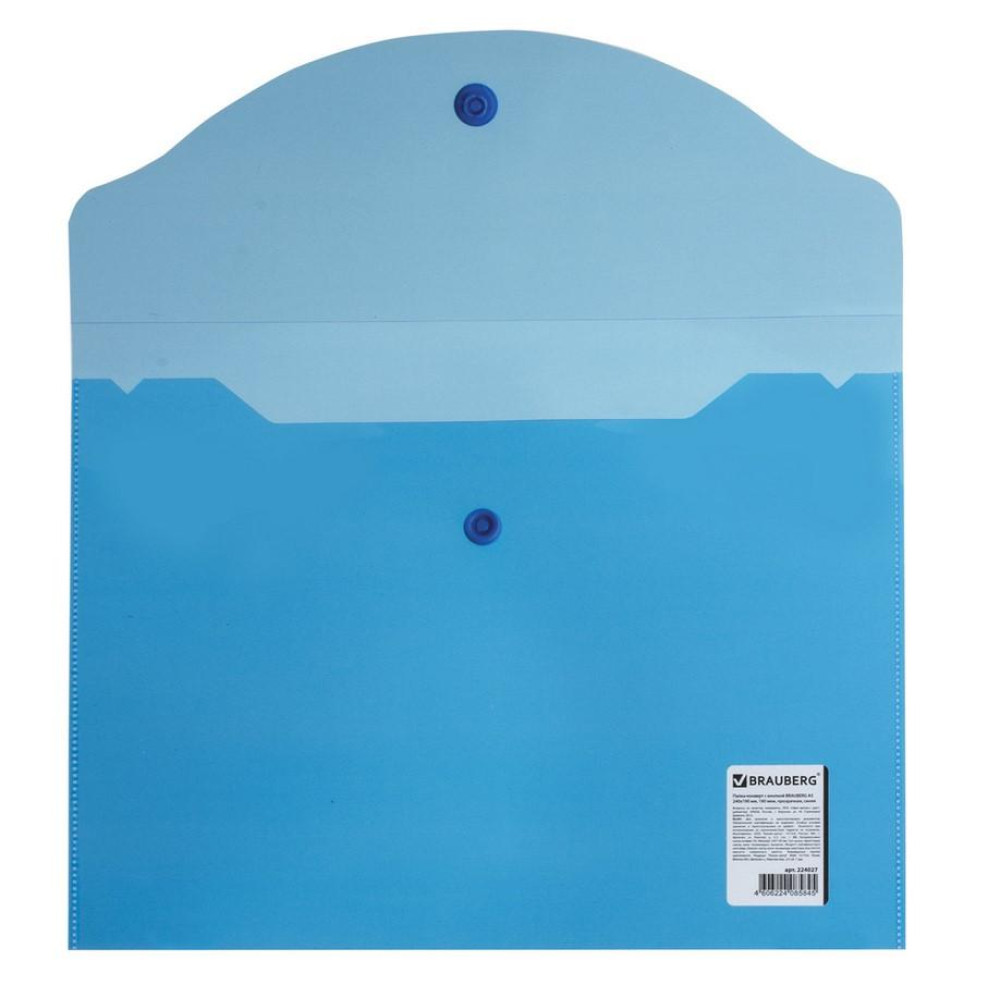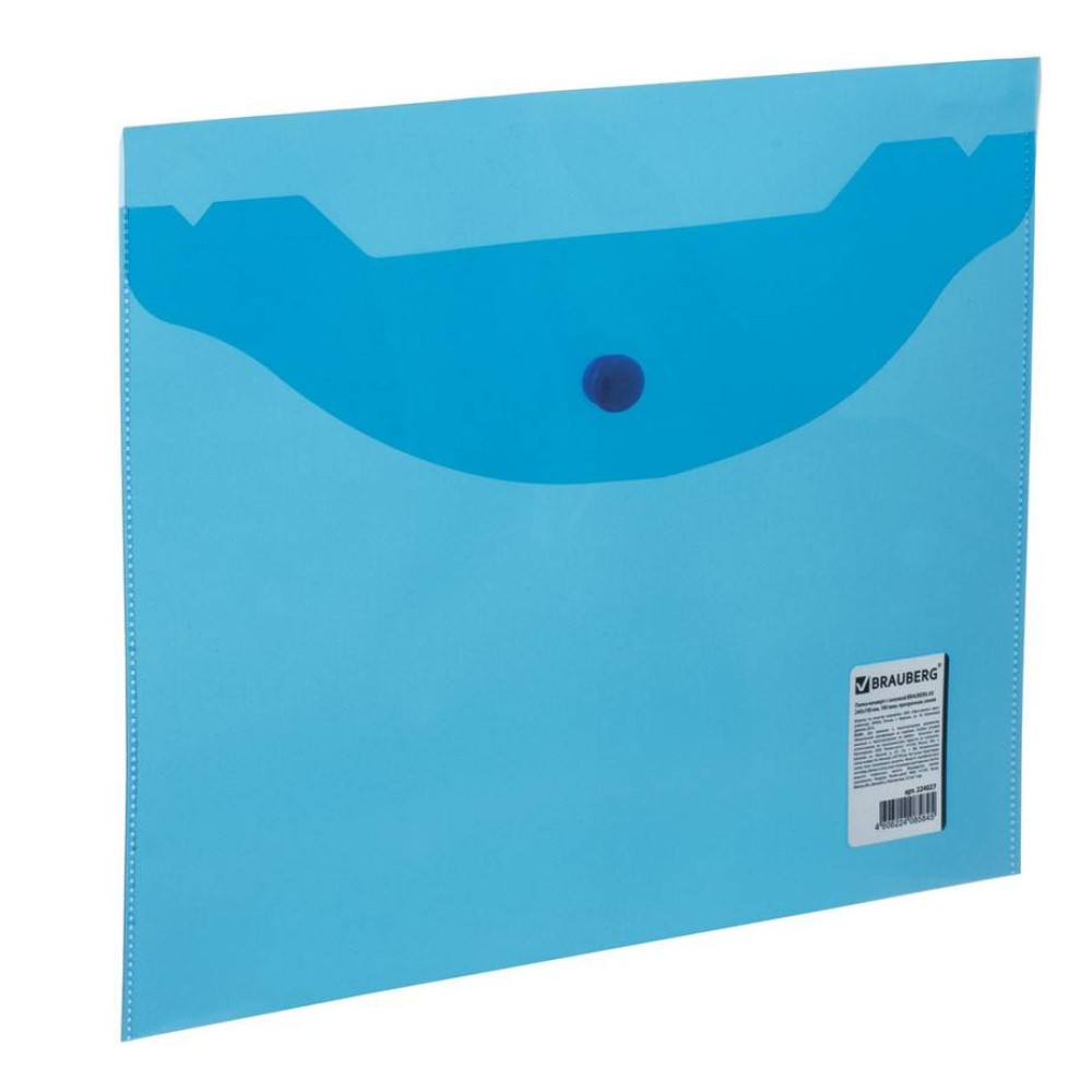Папка-конверт Brauberg на кнопке. Папка-конверт с гладкой фактурой формата А5 изготовлена из плотного прозрачного пластика синего цвета толщиной 180 мкм. Закрывается на защелку-кнопку, что делает удобным частое использование и обеспечивает быстрый доступ к ее содержимому. Папка способна вместить до 100 листов стандартной плотности.