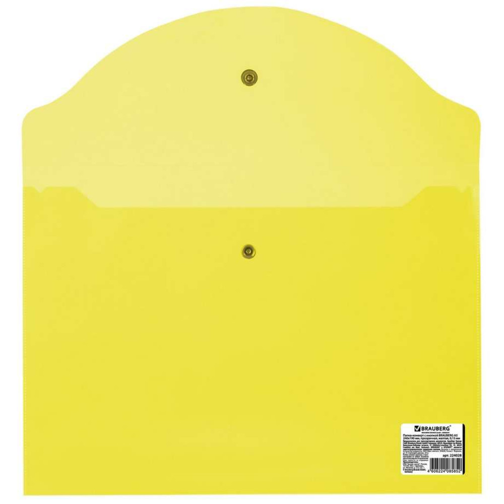 Папка-конверт Brauberg на кнопке. Папка-конверт с гладкой фактурой формата А5 изготовлена из плотного прозрачного пластика жёлтого цвета толщиной 180 мкм. Закрывается на защелку-кнопку, что делает удобным частое использование и обеспечивает быстрый доступ к ее содержимому. Папка способна вместить до 100 листов стандартной плотности.