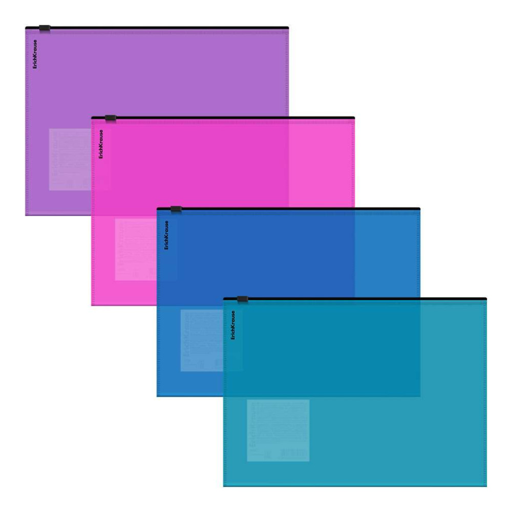 Папка-конверт ErichKrause "Fizzy Vivid" на zip-молнии формата А5+ из высококачественного полупрозрачного пластика с текстурой поверхности "апельсиновая корка", на которой не видно отпечатков пальцев и мелких царапин. Предназначен для хранения и транспортировки небольшого количества документов. Цвет ZIP-пакета – ассорти: бирюзовый, синий, фиолетовый, маджента. Удобная ZIP-молния обеспечивает быстрый доступ к бумагам.