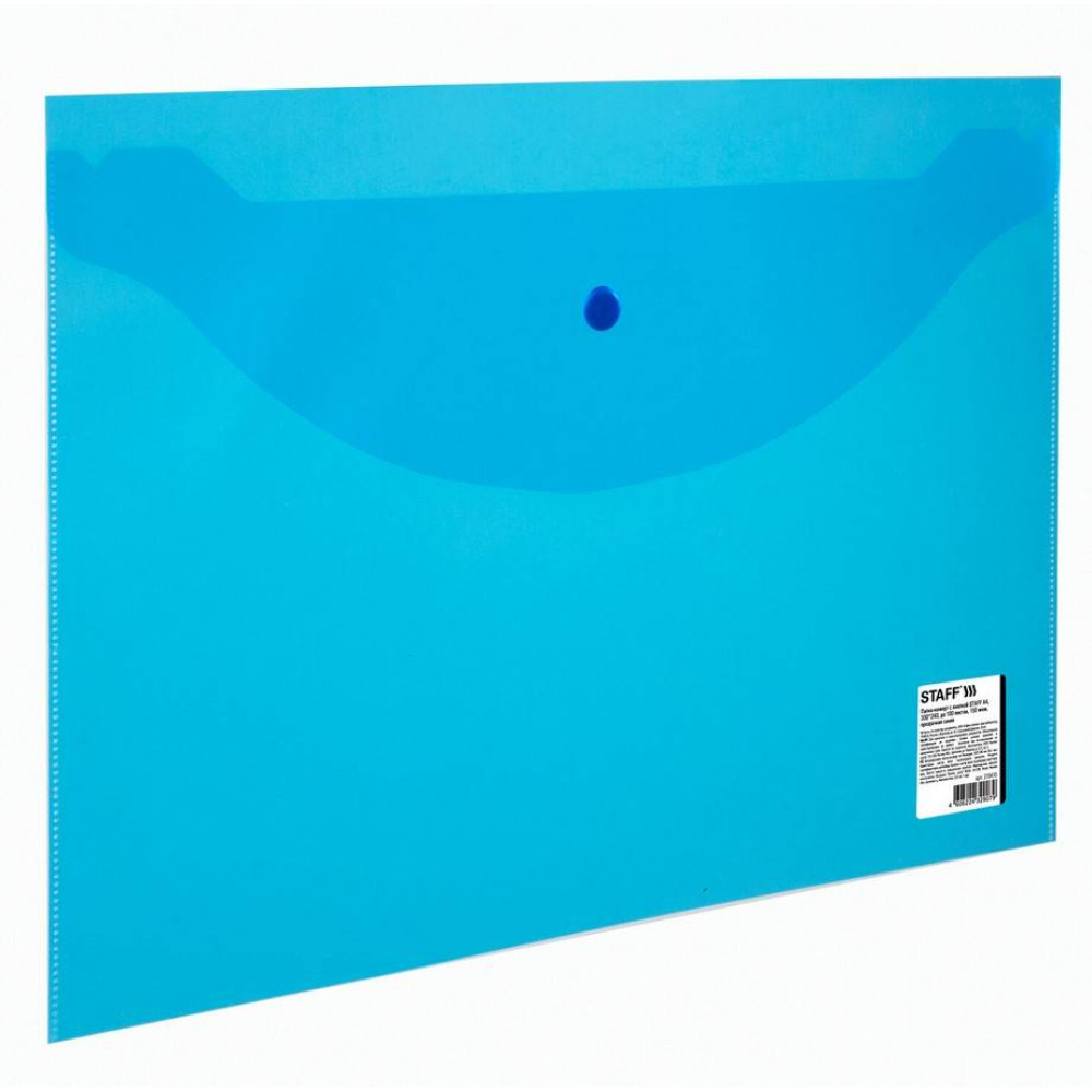 Полупрозрачная папка-конверт Staff синего цвета для документов формата А4. Папка изготовлена из плотного пластика толщиной 150 мкм. Папка закрывается клапаном на кнопку и