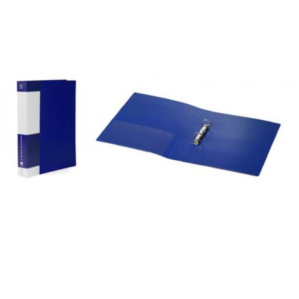 Папка на кольцах из пластика толщиной 700 мкм (0,7 мм) синего цвета. Металлический механизм содержит два кольца диаметром по 40 мм для закрепления перфорированных файлов, папок, документов.
