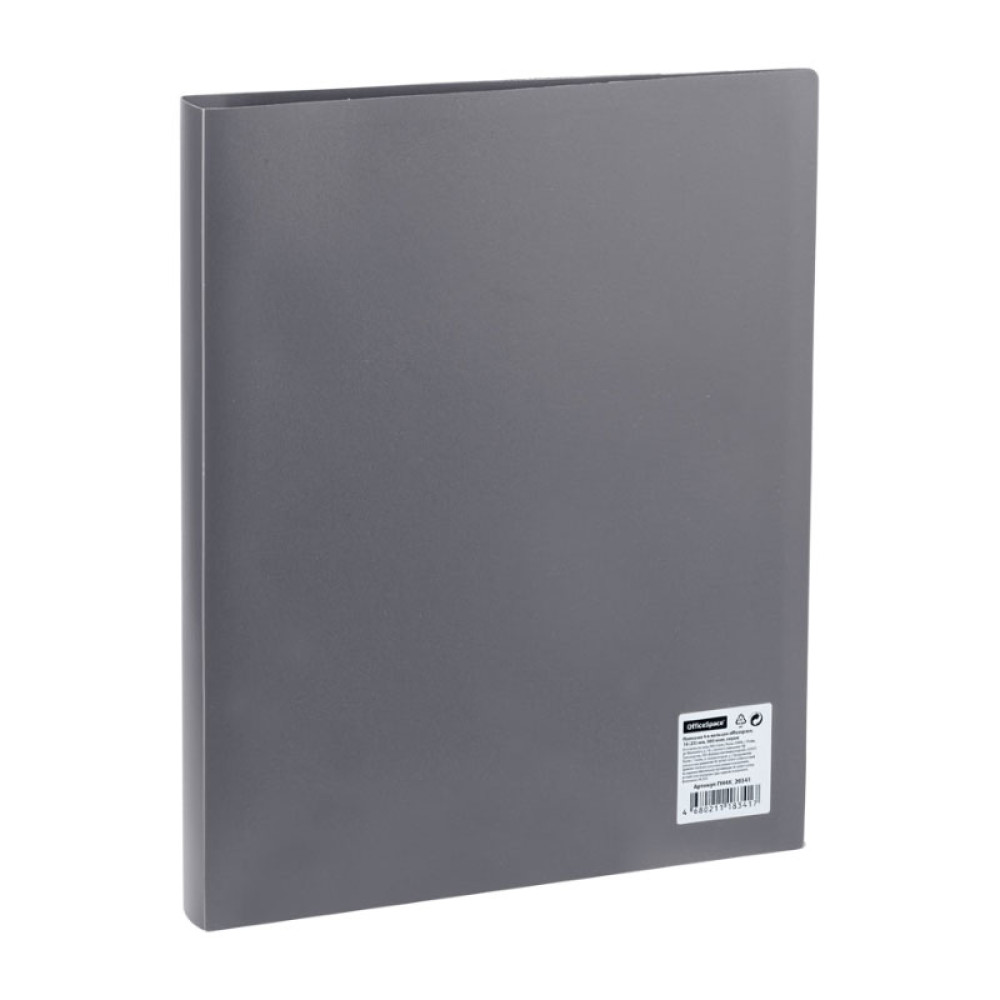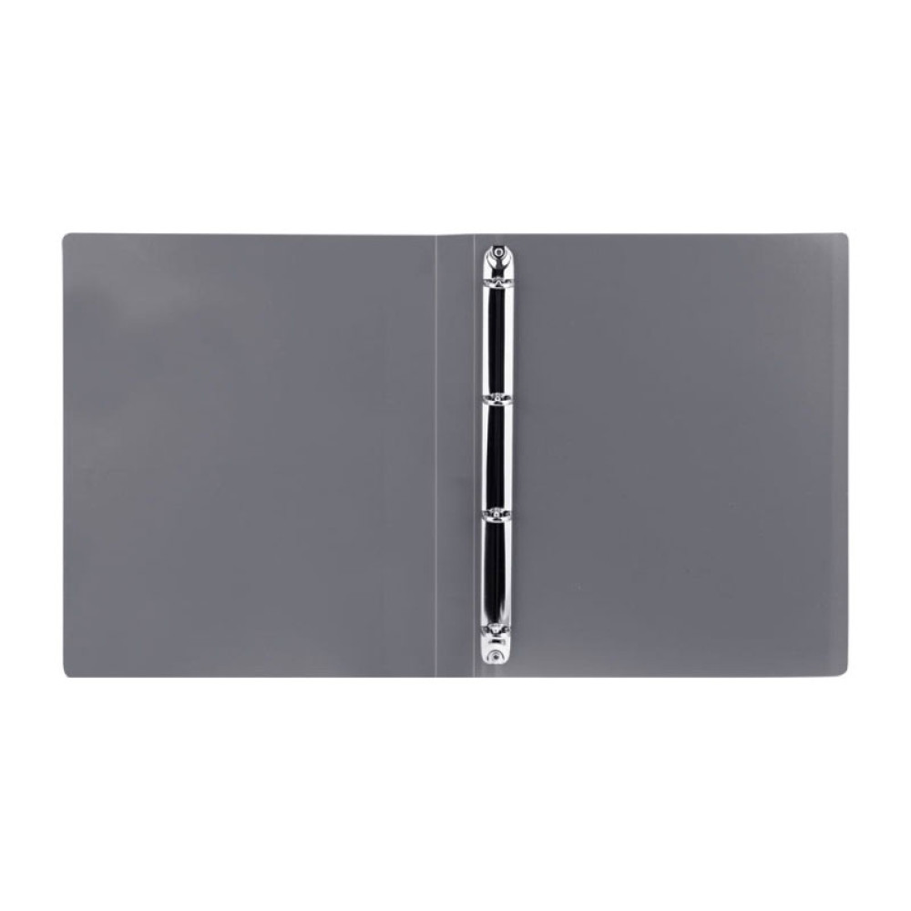Пластиковая папка OfficeSpace формата А4 серого цвета с кольцевым механизмом, состоящим из 4-х колец. Предназначена для хранения документов и файлов.