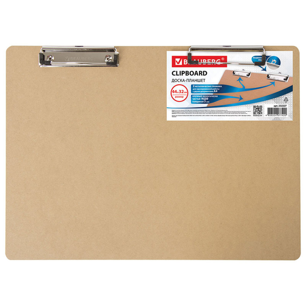 Доска-планшет с 2-мя зажимами Brauberg "Eco" используется для работы со счетами, накладными и другими документами. Незаменима при работе на складе, в магазине, при участии в конференциях, выставках и других публичных выступлениях. Доска-планшет формата А3 с верхними прижимами без крышки фиксирует до 90 листов.