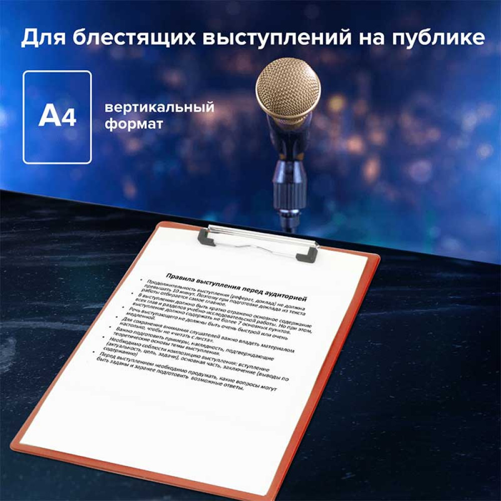 Планшет с зажимом Brauberg "Number One" используется для работы со счетами, накладными и другими документами. Незаменима при работе на складе, в магазине, при участии в конференциях, выставках и других публичных выступлениях. Доска-планшет формата А4 с верхним прижимом без крышки фиксирует до 90 листов. Изготовлена из плотного картона с покрытием из износоустойчивого ПВХ толщиной 2,8 мм, что позволяет комфортно делать записи на весу. Металлический прижим обеспечивает плотное прилегание документов, а выдвижной подвес позволяет разместить планшет на вертикальной поверхности.