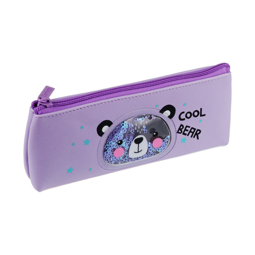 Пенал-косметичка Berlingo "Cool bear" из полиуритана сиреневого цвета с одним отделением, который закрывается на молнию. На лицевой поверхности пенала-прозрачное ПВХ окошко с пайетками-звездочками.