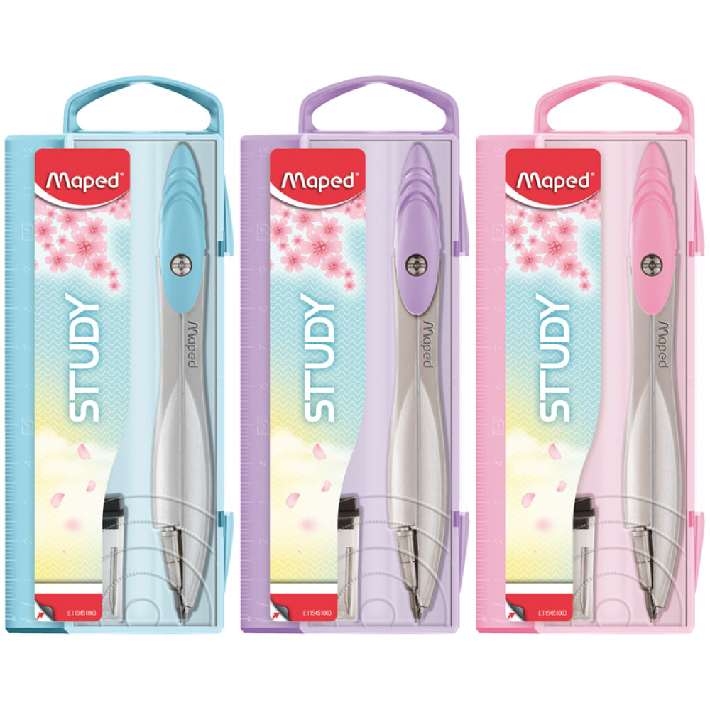Циркуль металлический Maped "Study" с дополнительным грифелем. Удобный футляр со сдвигающейся крышкой.