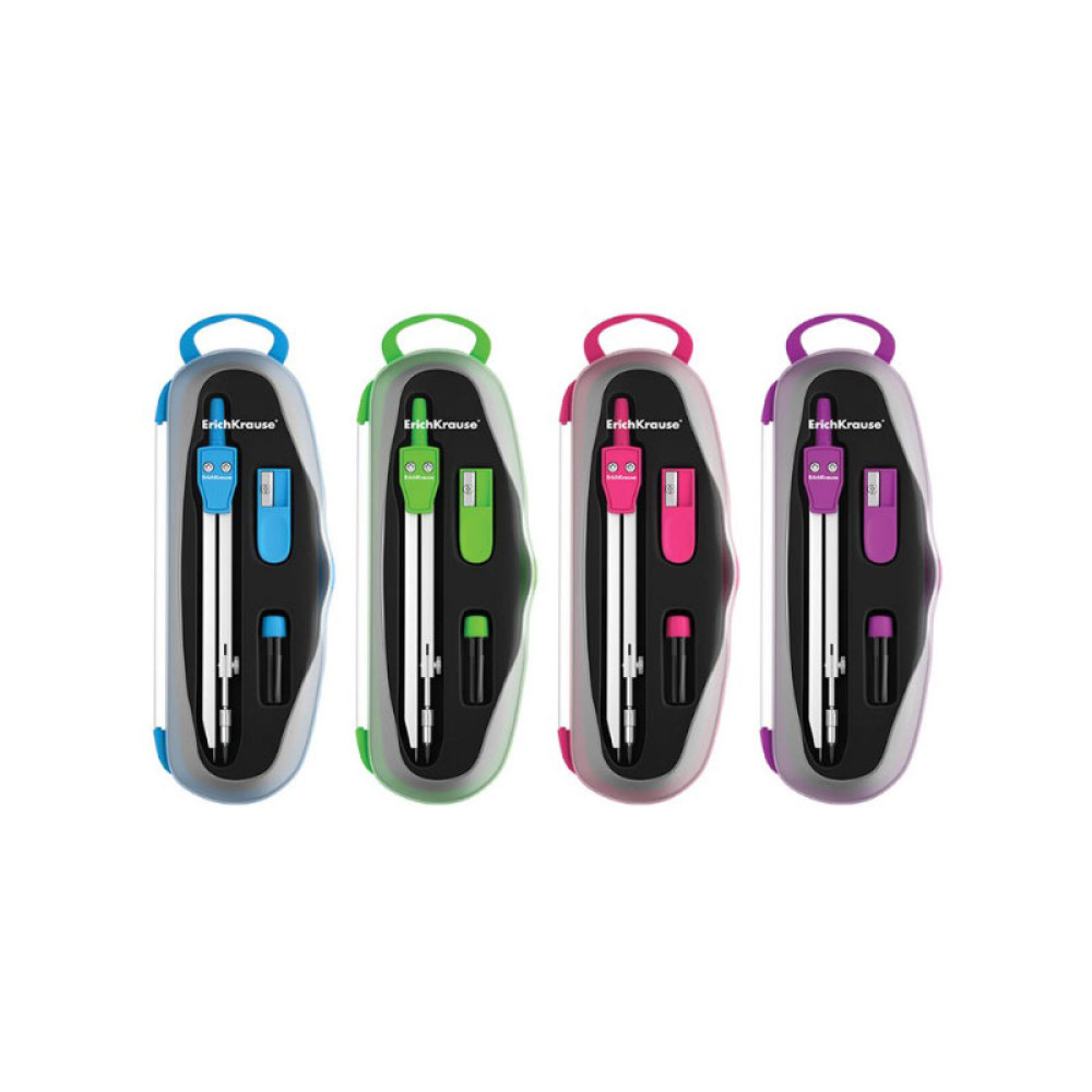 пластиковом футляре. В комплект входят точилка и сменный грифель в пластиковом контейнере. Представлен в ярких неоновых цветах. Максимальный радиус окружности 21 см.