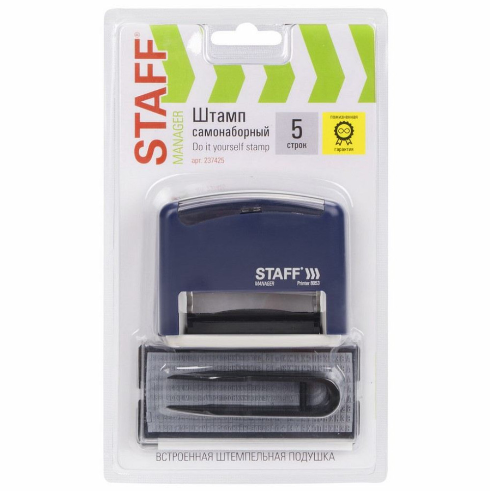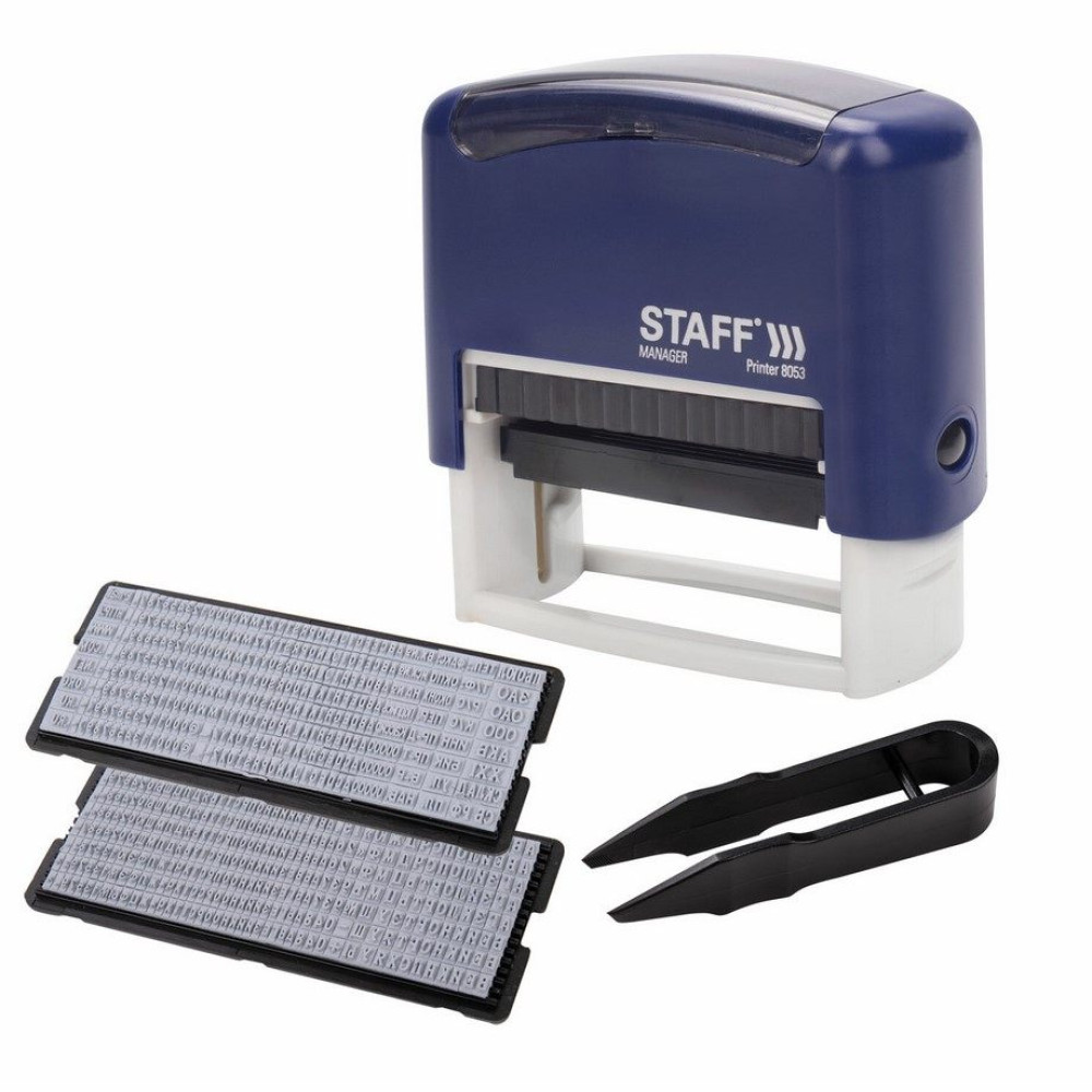 Штамп самонаборный Staff "Printer 8053" для создания оттиска с собственным содержанием, что позволяет существенно экономить рабочее время при нанесении необходимых отметок на документы. Платформа штампа позволяет набирать, а при необходимости оперативно менять до 5 строк текста и оставляет оттиск размером 58х22 мм синего цвета. Максимальное количество строчных букв в строке – 35, а прописных – 23. Длина строчной буквы составляет около 2,2 мм, а прописной – 3,1 мм. Корпус изготовлен из качественного износоустойчивого пластика. Верхняя часть корпуса выполнена в темно-синем цвете, а нижняя часть – в светло-сером. Надежные фиксаторы, располагающиеся по бокам, позволяют удерживать подвижную часть штампа в статичном положении. В специальное прозрачное окно на верхней части корпуса можно вставить образец текста для его идентификации в процессе использования штампа. Замена подушки не составляет труда. На механизм распространяется пожизненная гарантия. Срок годности сменной подушки составляет 6 лет (дата изготовления указана на упаковке). В состав комплекта входят: пластиковая оснастка, штемпельная подушка, касса русских букв и английских букв, цифр и символов, цифр и символов, пинцет.