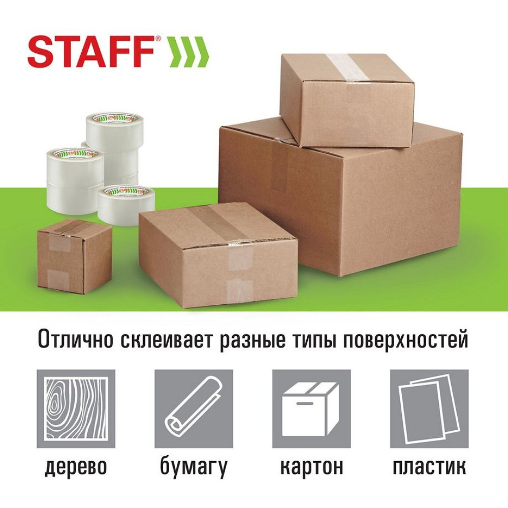Упаковочная клейкая лента Staff активно используется в торговле, промышленности, быту и подходит для оперативной упаковки с помощью диспенсера или вручную. Отличается высокой адгезией клея (слипанием с поверхностью) и стойкостью к разрыву. Толщина скотча 40 мкм позволяет переносить воздействие низких температур и влажности и выдерживать вес коробки 15-17 кг. Клейкой ленты шириной 48 мм и длиной намотки 120 м хватит на продолжительное время.