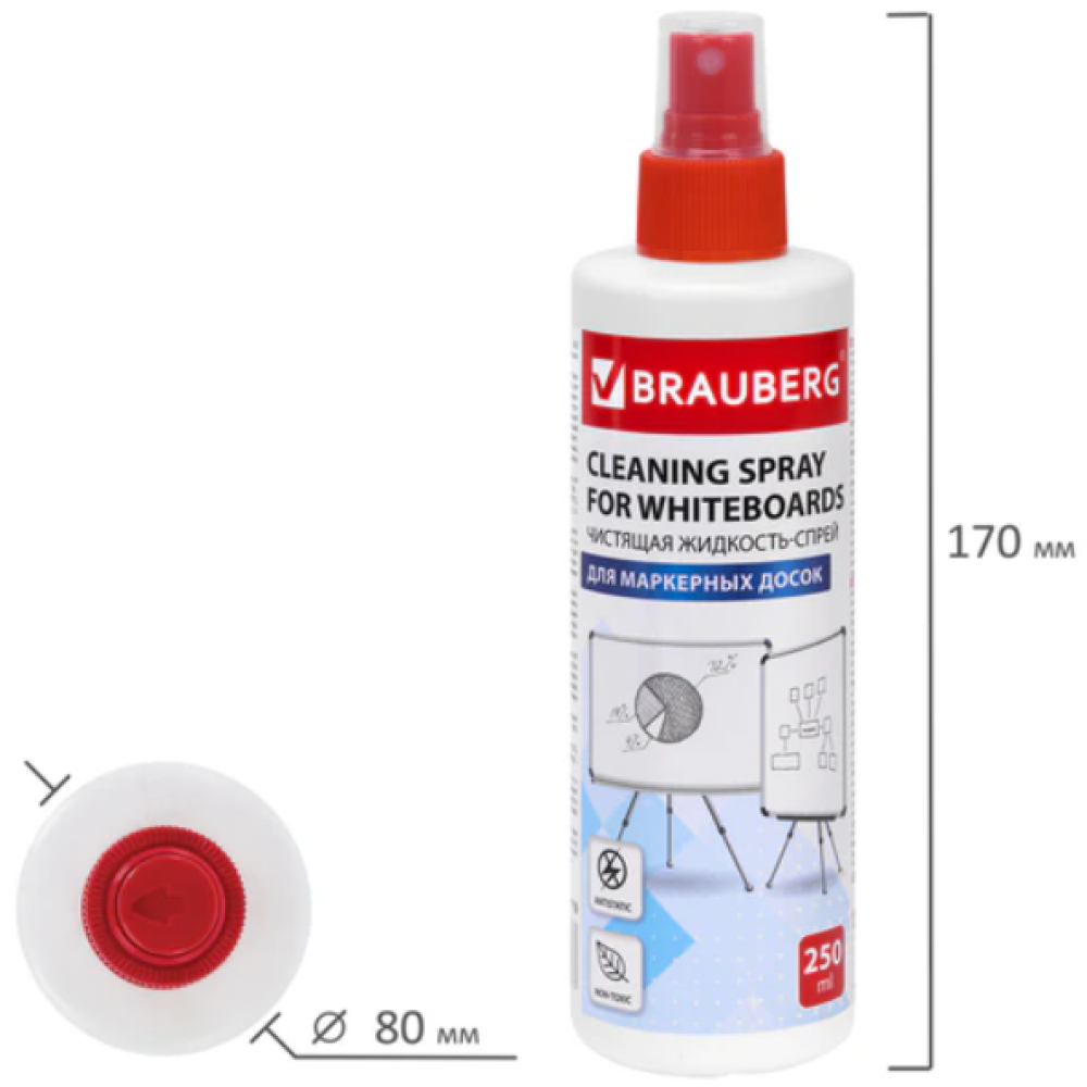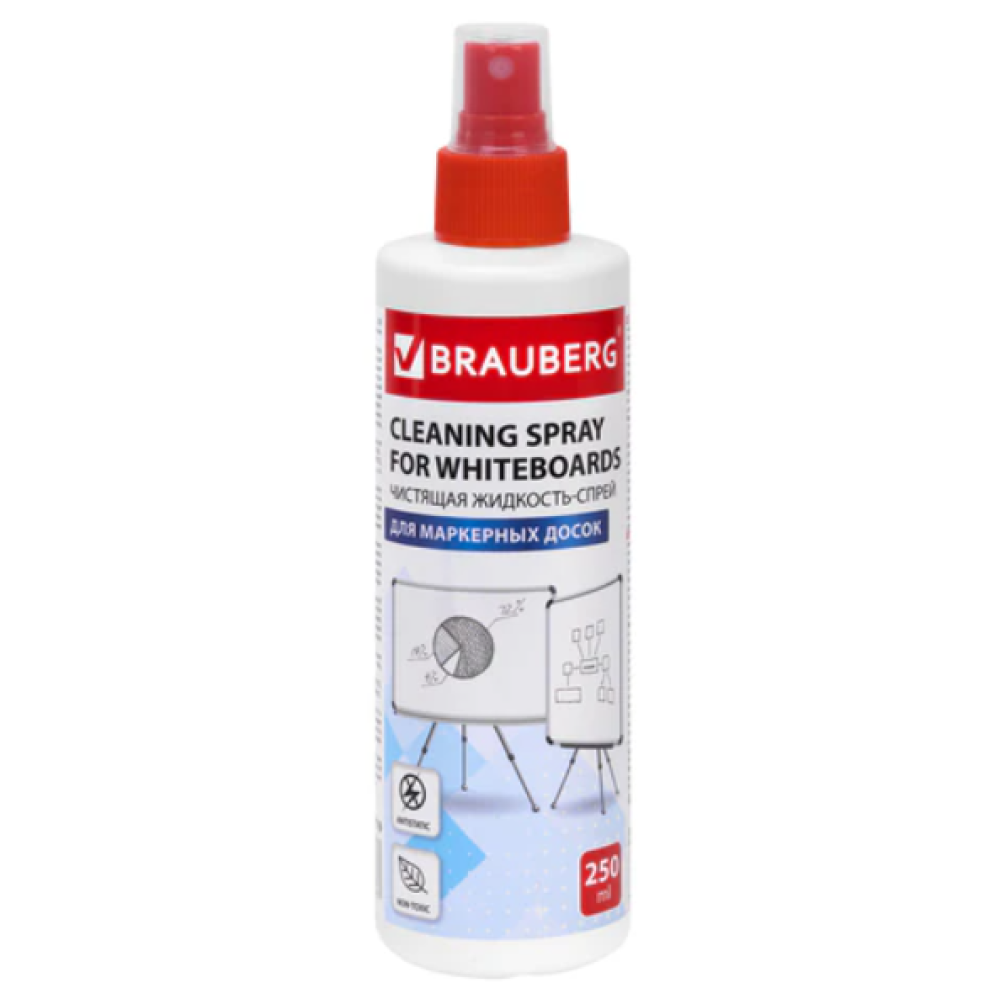 Чистящая жидкость-спрей BRAUBERG предназначена для очистки поверхности маркерных досок. Удаляет следы сухого маркера, пыли, отпечатков пальцев и других загрязнений, а также дезинфицирует поверхность. Спрей имеет объем 250 мл. Подходит для ежедневного применения. Обладает антистатическим эффектом. Рекомендуется к использованию вместе с сухими стирающими салфетками.