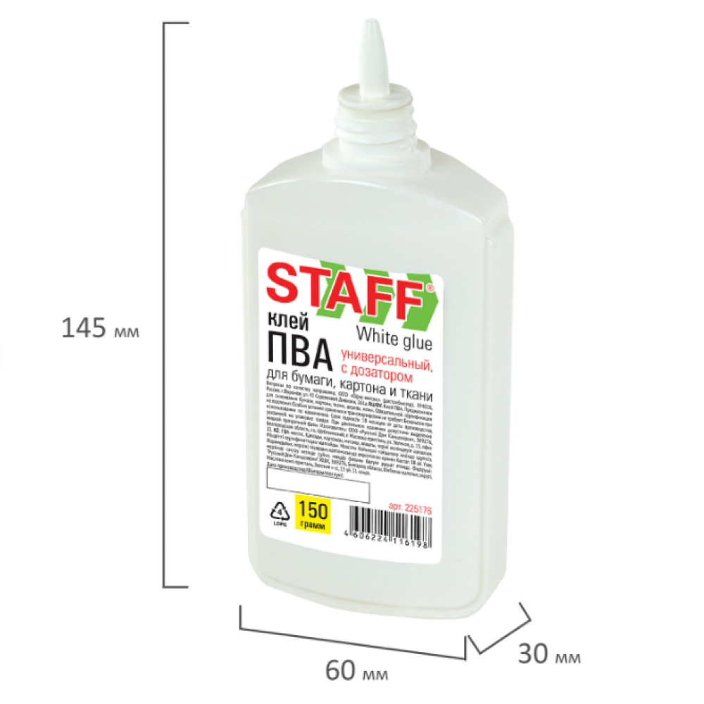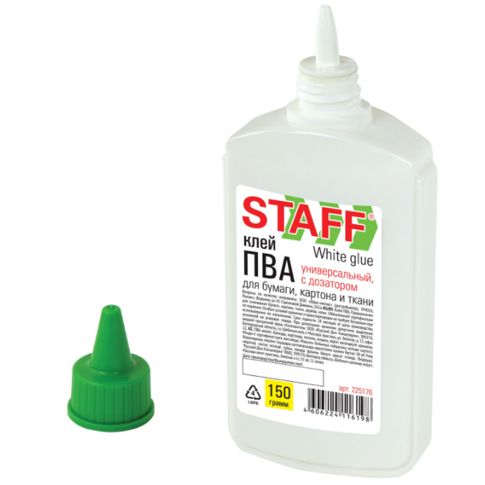 Клей ПВА STAFF применяется для склеивания бумаги, картона, фотографий, дерева. Имеет увеличенный объем 150 мл. Флакон оснащен пластиковым дозатором, который позволяет равномерно и точно наносить клей на поверхность. Нетоксичен, морозоустойчивый. Быстрое склеивание достигается за счет нанесения тонкого слоя клея. Экономичное расходование. Съемный колпачок предохраняет клей от засыхания. Необходимо взболтать перед применением.