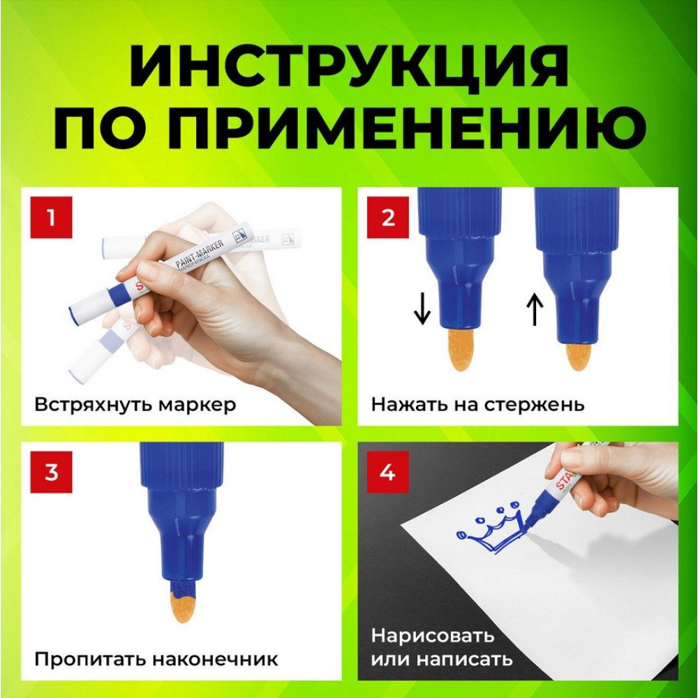 Маркер-краска лаковая Staff "Profit" для маркировки различных поверхностей: бетон, дерево, стекло, металл, резина, пластик. Подходит для использования как в промышленных, так и в бытовых целях. Высококачественные чернила синего цвета с лаковым эффектом идеально подходят для нанесения долговечной маркировки на любые поверхности. Благодаря усиленной формуле чернил краска ложится ровным слоем, полностью закрашивая поверхность. С помощью круглого прочного наконечника, выполненного из пористого акрила с шириной линии письма 2-4 мм, можно легко наносить широкие линии равномерным и однородным слоем. Быстросохнущие чернила предотвращают смазывание в процессе маркировки. После высыхания надписи становятся термо- и водостойкими, а также устойчивыми к выцветанию и механическому истиранию. Отлично подходит для маскировки бытовых дефектов, таких как царапины и сколы. Надежный помповый механизм подачи чернил предотвращает вытекание и разбрызгивание в процессе использования, а также преждевременное высыхание. Корпус маркера выполнен из алюминия, внутри находятся 2 металлических шарика для взбалтывания краски. Цвет колпачка соответствует цвету чернил.
